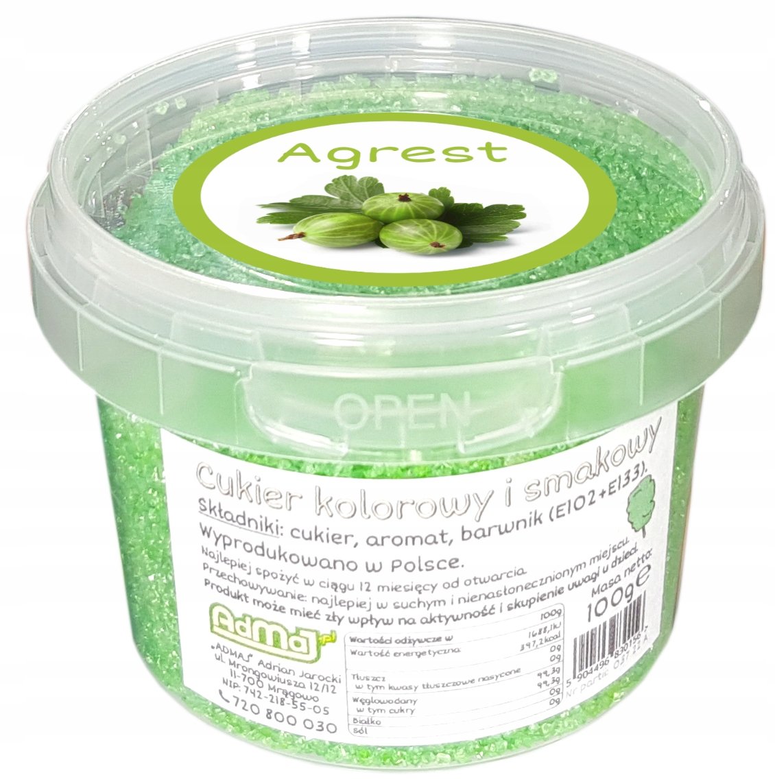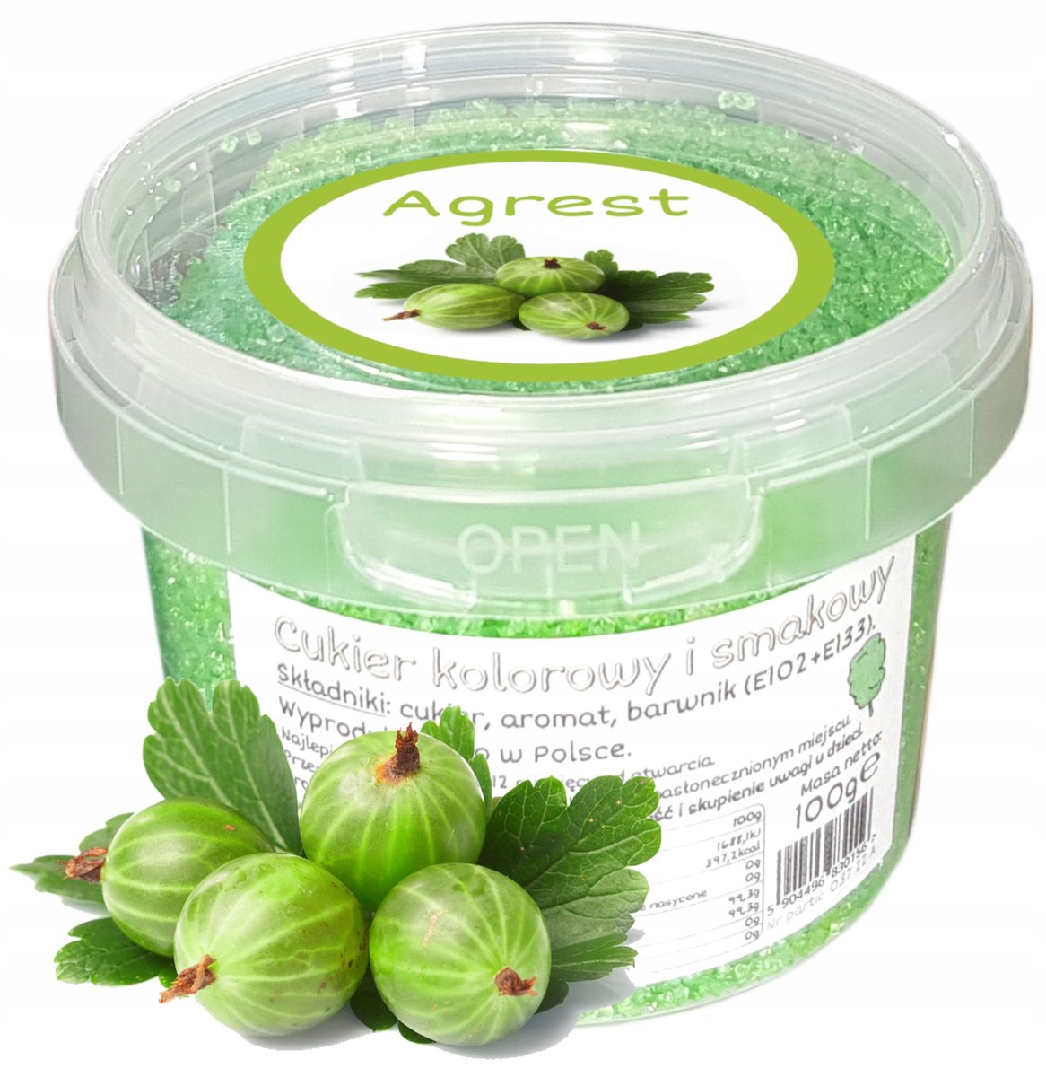 Pragniemy przedstawić naszą ofertę - kolorowy cukier 100g w wiaderku, zielony o smaku i zapachu agrestu.