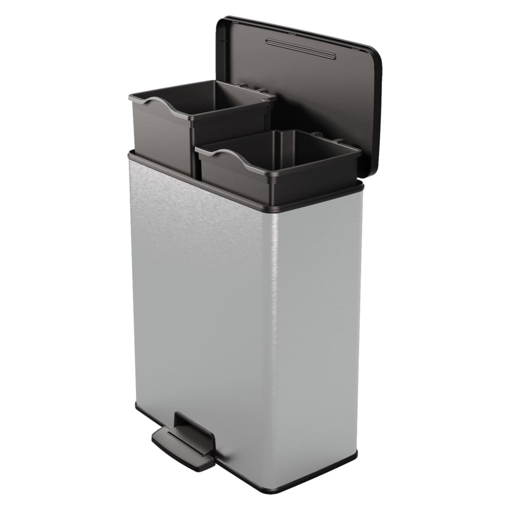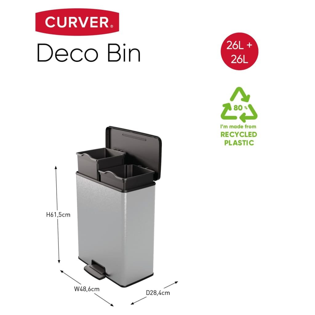 Ten podwójny kosz na śmieci z pedałem Deco marki Curver to wyjątkowy produkt wśród koszy na śmieci. Jest wyposażony w dwa wewnętrzne wiadra o pojemności 26 litrów, dzięki czemu segregacja odpadów jest bardzo łatwa. Wykończenie z metalicznym efektem: ten prostokątny kosz na śmieci ma stylowy, metalowy wygląd i zalety tworzywa sztucznego. Jest lekki i nie musisz się martwić o rdzę i wgniecenia, a odciski palców nie są widoczne. Higieniczny, wytrzymały pedał ułatwiający otwieranie: dzięki dużemu pedałowi kosz można łatwo i higienicznie otworzyć, dzięki czemu ten kosz na śmieci będzie niezbędnym przedmiotem w Twoim domu.Dwa wewnętrzne pojemniki: kosz na śmieci Deco marki Curver to idealne rozwiązanie do recyklingu. Posiada dwa wewnętrzne wiadra o pojemności 26 L i 26 L. Ponadto dwie przegródki można wyjąć. Kosz może być również używany jako jednokomorowy kosz o pojemności 65 litrów. Kolorowe klipsy do segregacji odpadów: ten podwójny kosz na śmieci jest dostarczany z zestawem kolorowych klipsów ułatwiających segregację odpadów. System zamykania zapewniający cichą pracę: pojemnik na odpady ma elastyczne obrzeże w pokrywie, dzięki czemu nie wydostają się z niego nieprzyjemne zapachy.