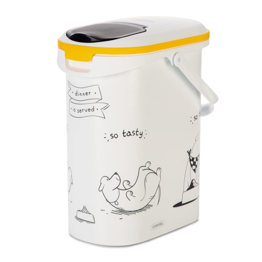 Masz w domu czworonożnego przyjaciela? Jeśli tak, potrzebujesz wygodnego pojemnika na karmę "Dinner is served" marki Curver, aby pozbyć się z domu zakurzonych toreb z karmą. Pojemnik ten pomieści 10 L, co idealnie służy zachowaniu świeżości suchej karmy i przysmaków do żucia dla Twojego psa. Ponadto chroni on karmę przed kurzem, wilgocią i insektami. Pokrywę otwiera się i zamyka z łatwością, co ułatwia napełnianie. Pojemnik ma poręczny otwór na górze, przez który można wysypać karmę prosto na miskę Twojego pupila. Dzięki uchwytowi można go bez trudu przenosić. Ten trwały, plastikowy pojemnik na karmę jest nie tylko praktyczny, ale również atrakcyjny dzięki wesołym rysunkom z psem.