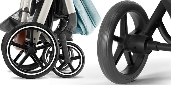Duże, bezobsługowe koła świetnie radzą sobie w każdym terenie. Wózek ze względu na design doskonale prezentuje się w miejskim szyku, jednak koła i amortyzacja pozwalają wykorzystać wózek w trudniejszych warunkach.
