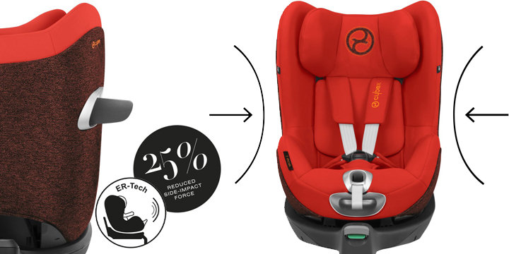 Ponadto, fotelik został wyposażony w skorupę absorbującą energię, która w połączeniu z systemem ochrony bocznej L.S.P. zadba o bezpieczeństwo dziecka podczas zderzenia bocznego, zmniejszając ryzyko poniesienia poważnych obrażeń o 25%.