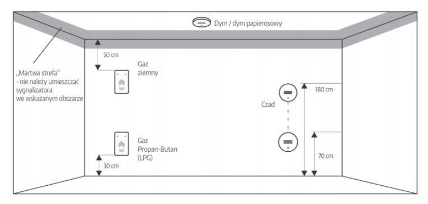 W miarę możliwości czujnik staramy się montować w każdym pomieszczeniu w którym może dojść do ulatniania się szkodliwych gazów