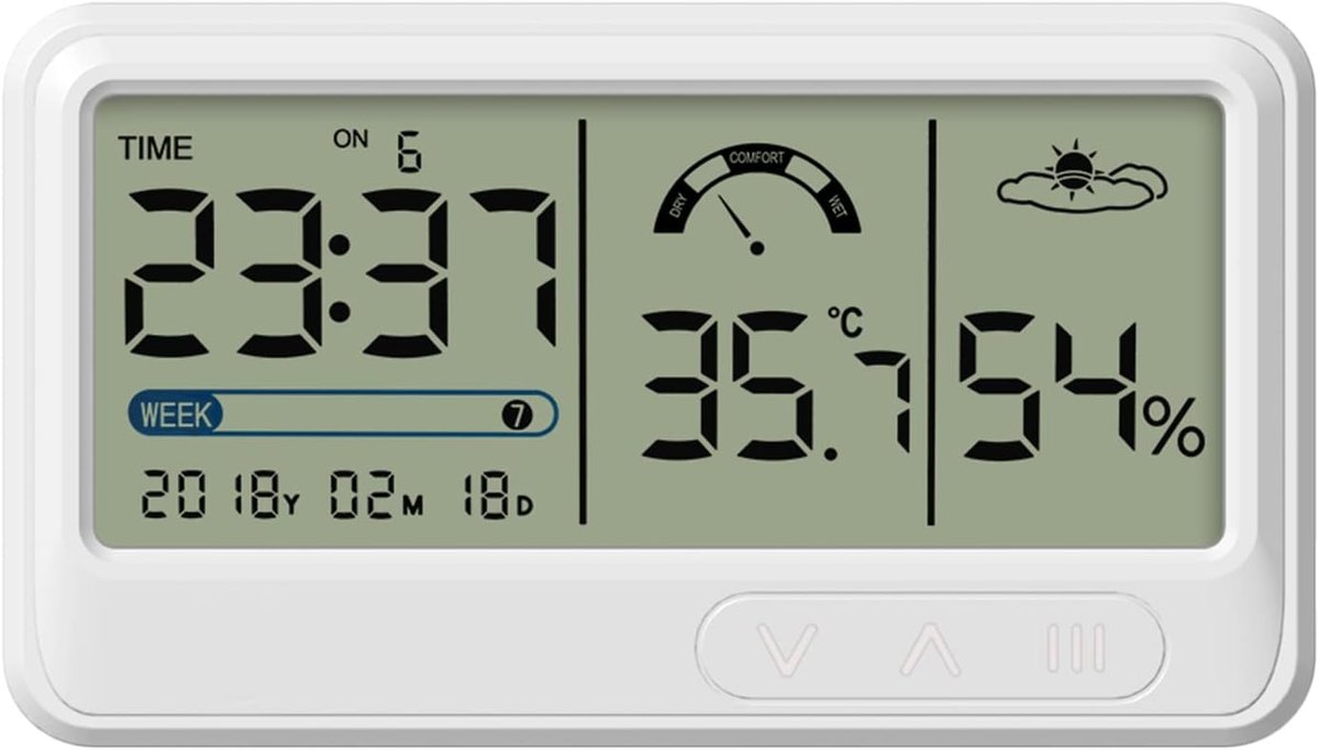 Wyświetlacz: czas, data, tydzień, wilgotność, temperatura (℃/℉)