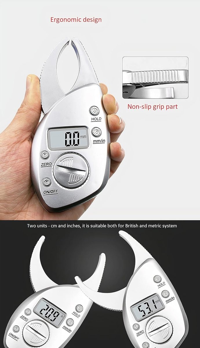 Łatwy w użyciu: wystarczy zmierzyć zmarszczki, a następnie użyć dołączonej tabeli, aby odczytać procent tkanki tłuszczowej odpowiadający określonej grubości zmarszczek.