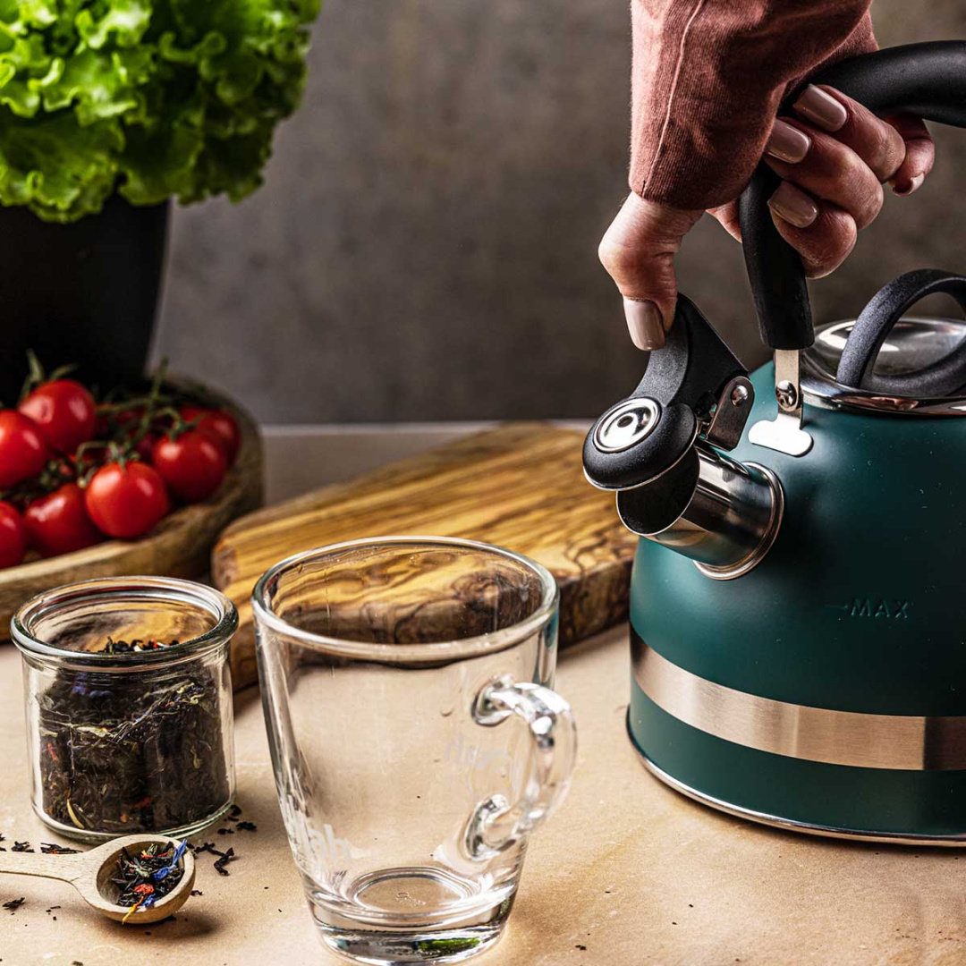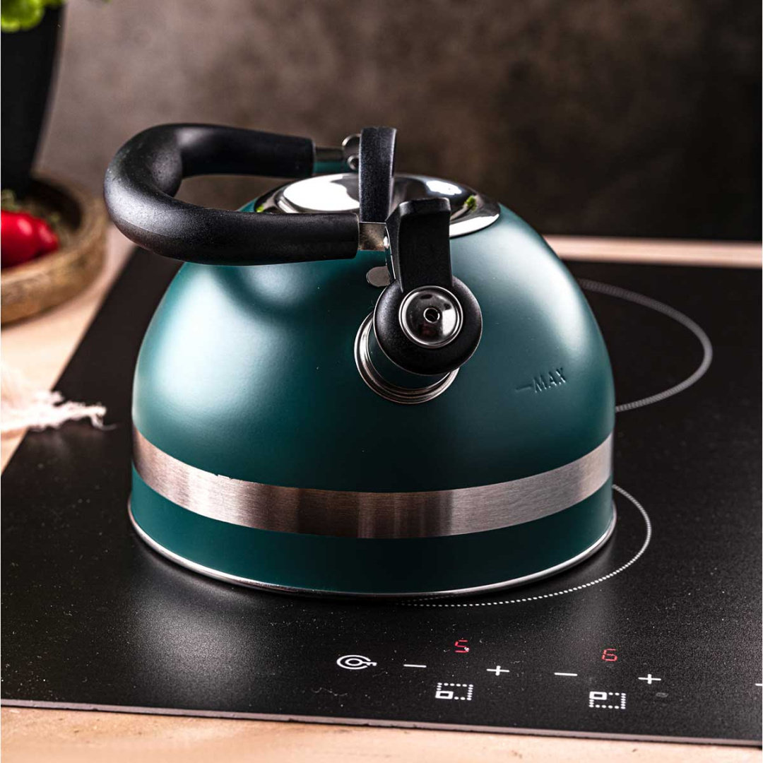 Czajnik tradycyjny o pojemności całkowitej 1,8L wykonany z wysokiej jakości lakierowanej stali nierdzewnej. Wyposażony w uchylny gwizdek informujący o gotującej się wodzie.