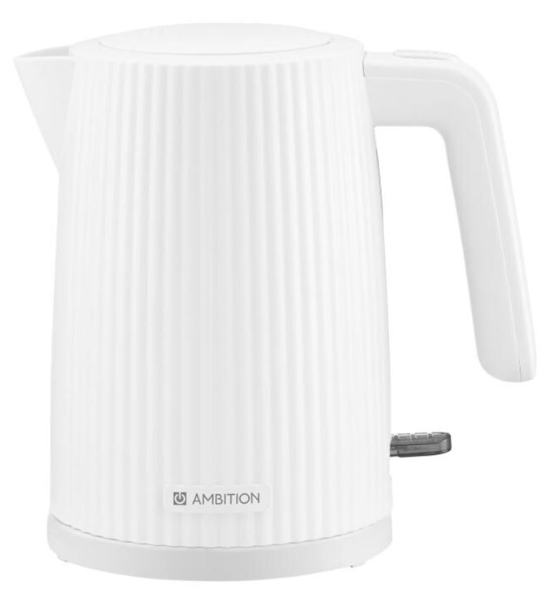Czajnik elektryczny Ambition o pojemności 1,7 litra to idealne rozwiązanie dla osób poszukujących wygody i nowoczesności w kuchni. Jego elegancka biała obudowa z dekoracyjnymi paskami sprawia, że doskonale wkomponuje się w różnorodne aranżacje wnętrz. Wyposażony w mocny i wydajny element grzejny o mocy 2200W, czajnik błyskawicznie zagotuje wodę, co oszczędza Twój czas.