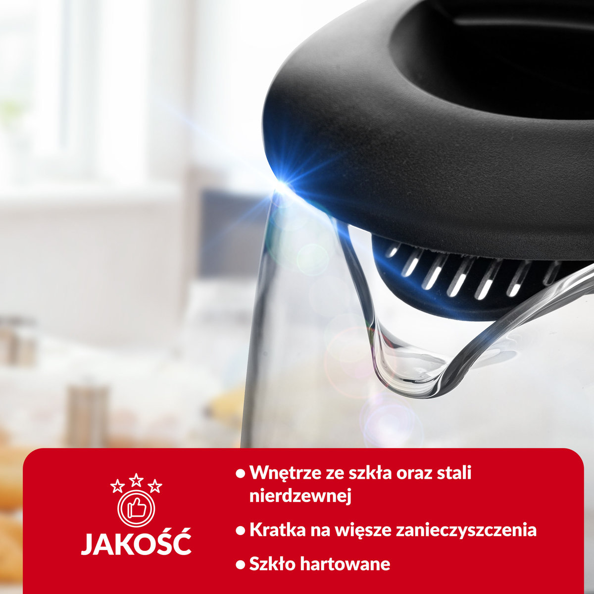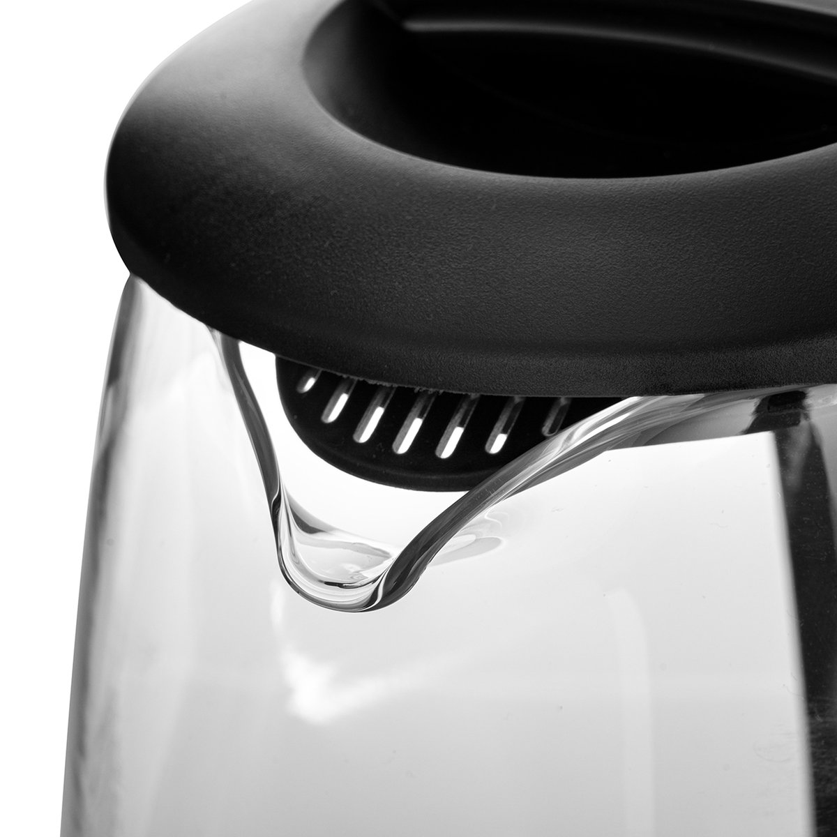 Szeroki dziubek wykonany ze szkła umożliwia wygodne nalewanie wody, wodę nalewa się szybko, a jednocześnie bezpiecznie kontrolując jej ilość delikatnym przechyleniem.