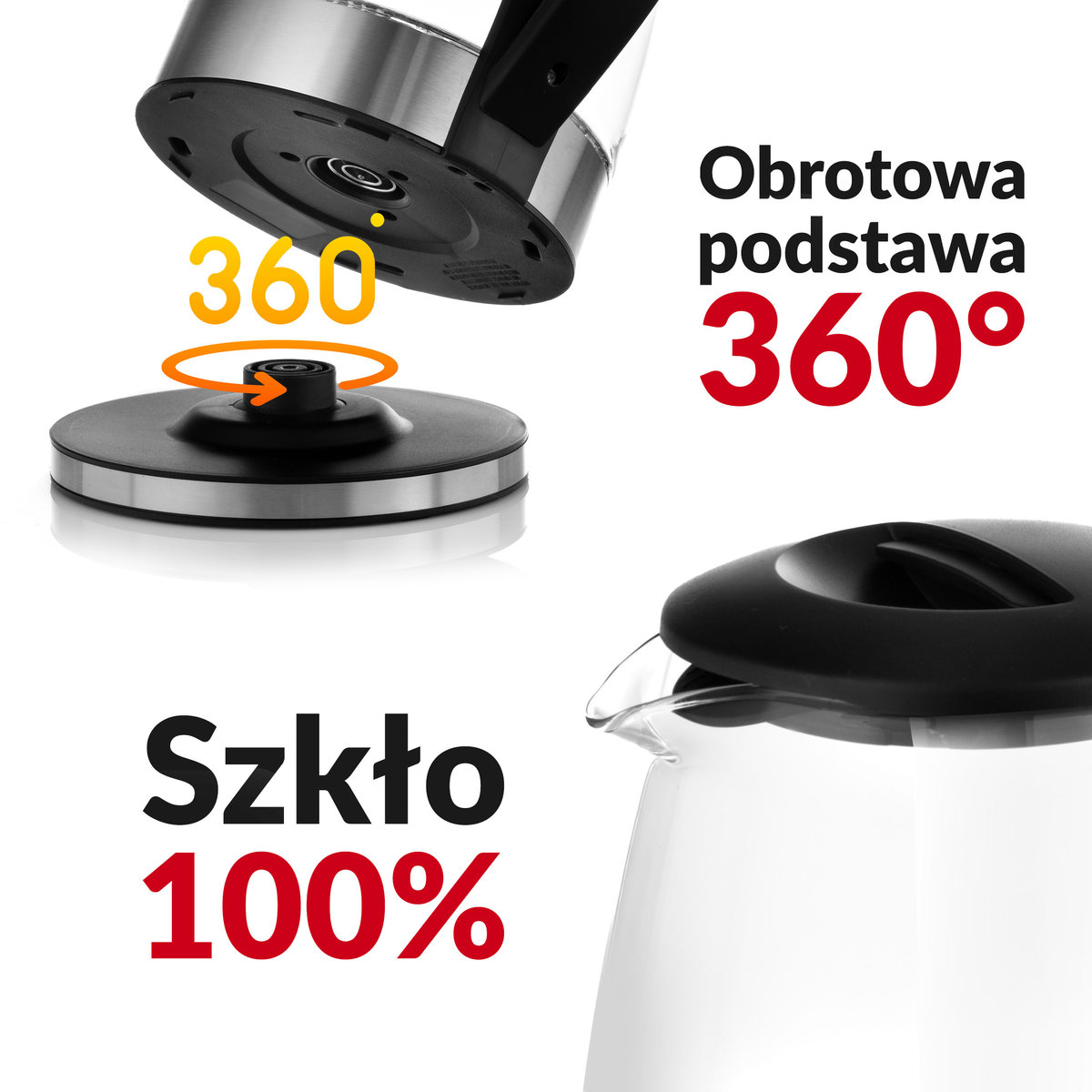Wygoda dla prawo i lewo-ręcznych osób. Odstawienie czajnika przestanie być kłopotliwe dzięki obrotowej podstawie w którą łatwo trafić i jeszcze prościej zdjąć z niej czajnik. Kabel zasilający ma aż 0,85 metra długości.