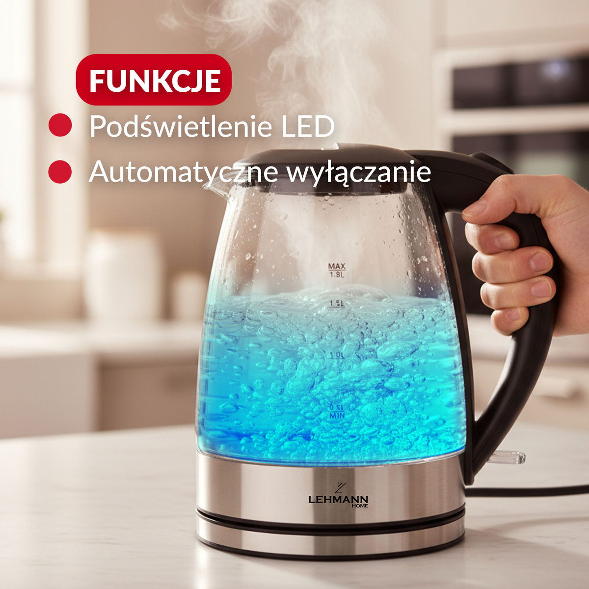 Mamy rozwiązanie na Twoje potrzeby! Czajnik bezprzewodowy Lehmann to urządzenie o imponujących parametrach technicznych, ale również przemyślanej konstrukcji. Jest mocny, szklany z podświetleniem LED, energooszczędny, nie zużywa niepotrzebnego prądu, a przy tym łatwo się czyści dzięki higienicznej szklanej powłoce.