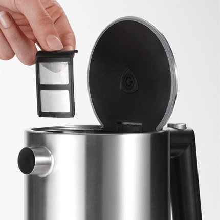 Wyjmowany filtr wapnia wykonany ze stali nierdzewnej, chroni przed przedostawaniem się kamienia oraz zanieczyszczeń do filiżanki oraz zapobiega powstawaniu mętnego osadu.