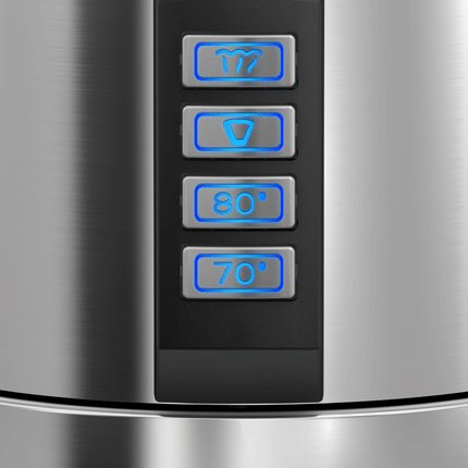 Łatwa intuicyjna obsługa za pomocą elektronicznej regulacji temperatury za naciśnięciem przycisku (70°C, 80°C, przycisk kawy i wrząca woda).