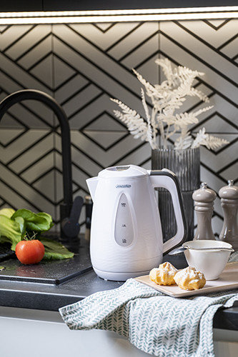 duży, elektryczny czajnik rodzinny, pozwalający sprawnie zagotować wodę na herbatę dla 6-7 osób dzięki mocy 2200 w. Zaopatrzony w wyraźny wskaźnik poziomu wody, wyłączy się automatycznie po jej zagotowaniu. Blokada uniemożliwi również włączenie pustego czajnika, oszczędzając w ten sposób energię i dbając o bezpieczeństwo użytkownika. Filtr osadów zapewni natomiast odpowiednią jakość wody. Dla wygody został zaopatrzony w obrotową podstawę, płaskie dno oraz grzałkę za stali szlachetnej i lampkę informująca o zagotowaniu wody. Biały i nie rzucający się w oczy pozwala zagotować na raz 1,7 l wody.pojemność max: 1,7 lpojemność min: 0,5 lpłaska grzałka ze stali szlachetnejfiltr zatrzymujący osady wapnialampka kontrolnadwustronny wskaźnik poziomu wody równie wygodny dla prawo- i leworęcznych użytkownikówautomatyczne wyłączanie obrotowa podstawa 360°obudowa wykonana z wytrzymałego polipropylenuschowek na przewód zasilającyprzycisk otwierający pokrywkęzasilanie: 220-240v ~50/60hzdługość przewodu zasilającego: 68 cmmoc nominalna 1850wmoc maksymalna 2200wwymiary produktu: 23,0 x 21,0 x 16,0 cmkolor: białykolor rączki: szarytyp wtyczki:e/f dodatkowy opis ze zdjęciami