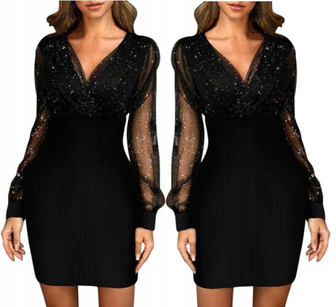 Właśnie zrecenzowałem Czarna Sukienka Damska Mini Elegancka Modna Kopertowa Długi Rękaw Cekiny M