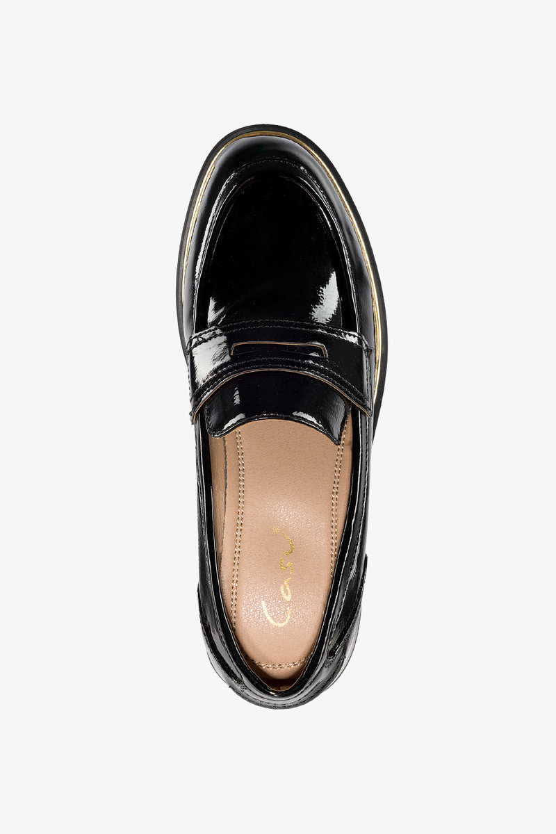 Właśnie zrecenzowałem Czarne mokasyny lakierowane na platformie damskie złoty pasek na podeszwie Casu M24X5-B-40