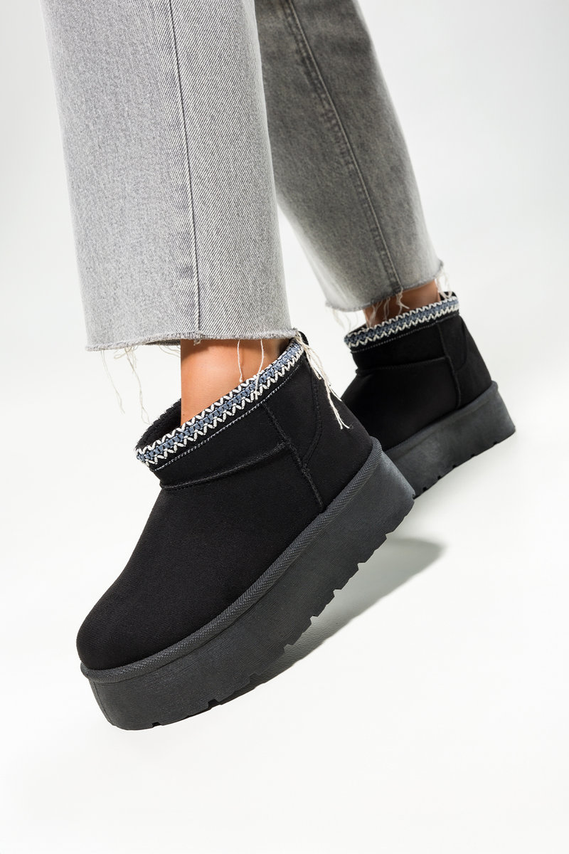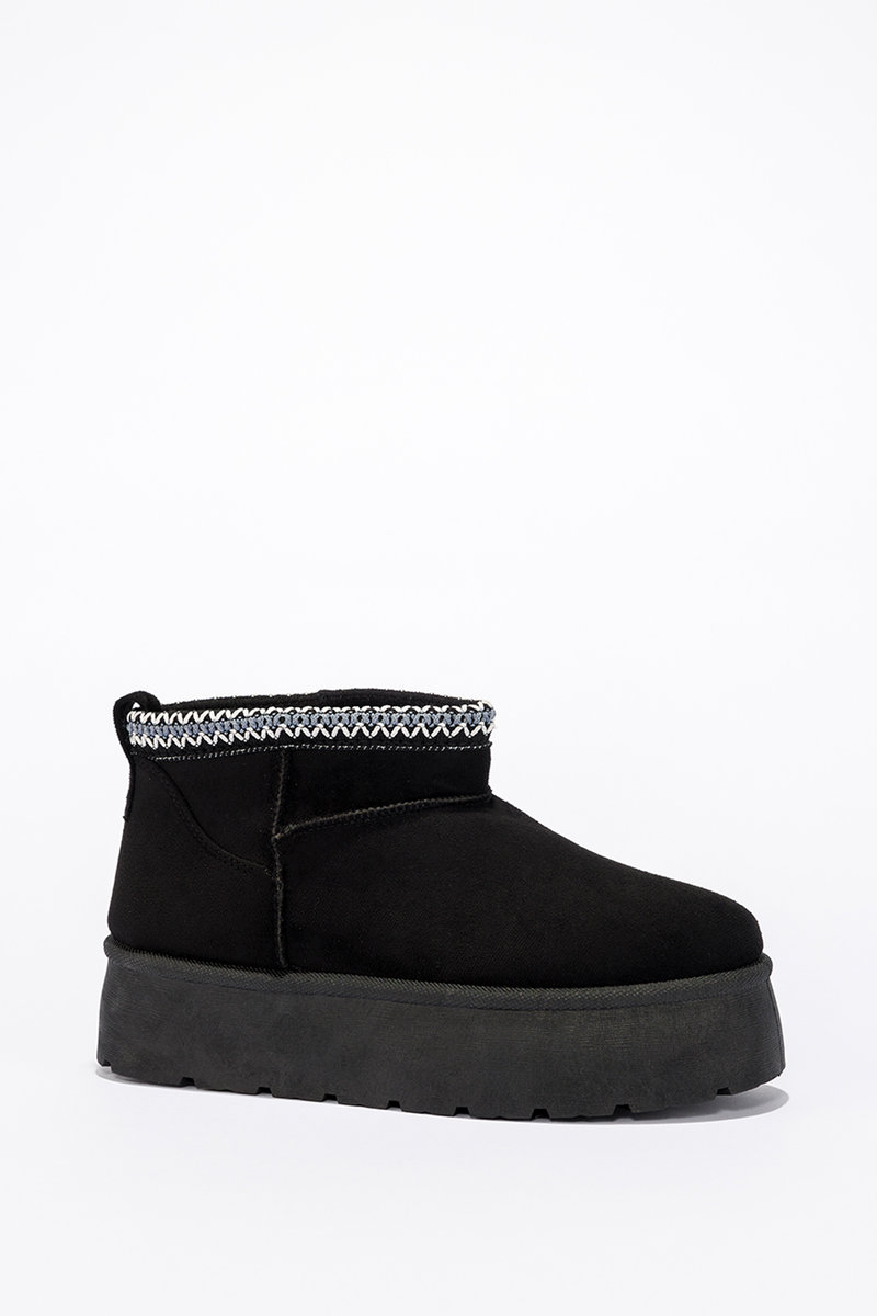 Czarne śniegowce mukluki damskie na bieżnikowanej platformie model HY877 to idealne połączenie stylu, wygody i funkcjonalności. Wykonane z najwyższej jakości zamszu ekologicznego, zapewniają nie tylko atrakcyjny wygląd, ale również trwałość na lata. Wnętrze butów zostało starannie ocieplone miękkim futerkiem, które gwarantuje ciepło nawet podczas najmroźniejszych dni. Dodatkowym atutem jest gruba, bieżnikowana platforma o wysokości 4,5 cm, która zapewnia stabilność i komfort podczas chodzenia. Model wyróżnia się wzorzystym wykończeniem w górnej części cholewki, co nadaje mu unikalnego, modnego charakteru. To obuwie, które nie tylko chroni przed zimnem, ale także świetnie wygląda w zimowych stylizacjach.