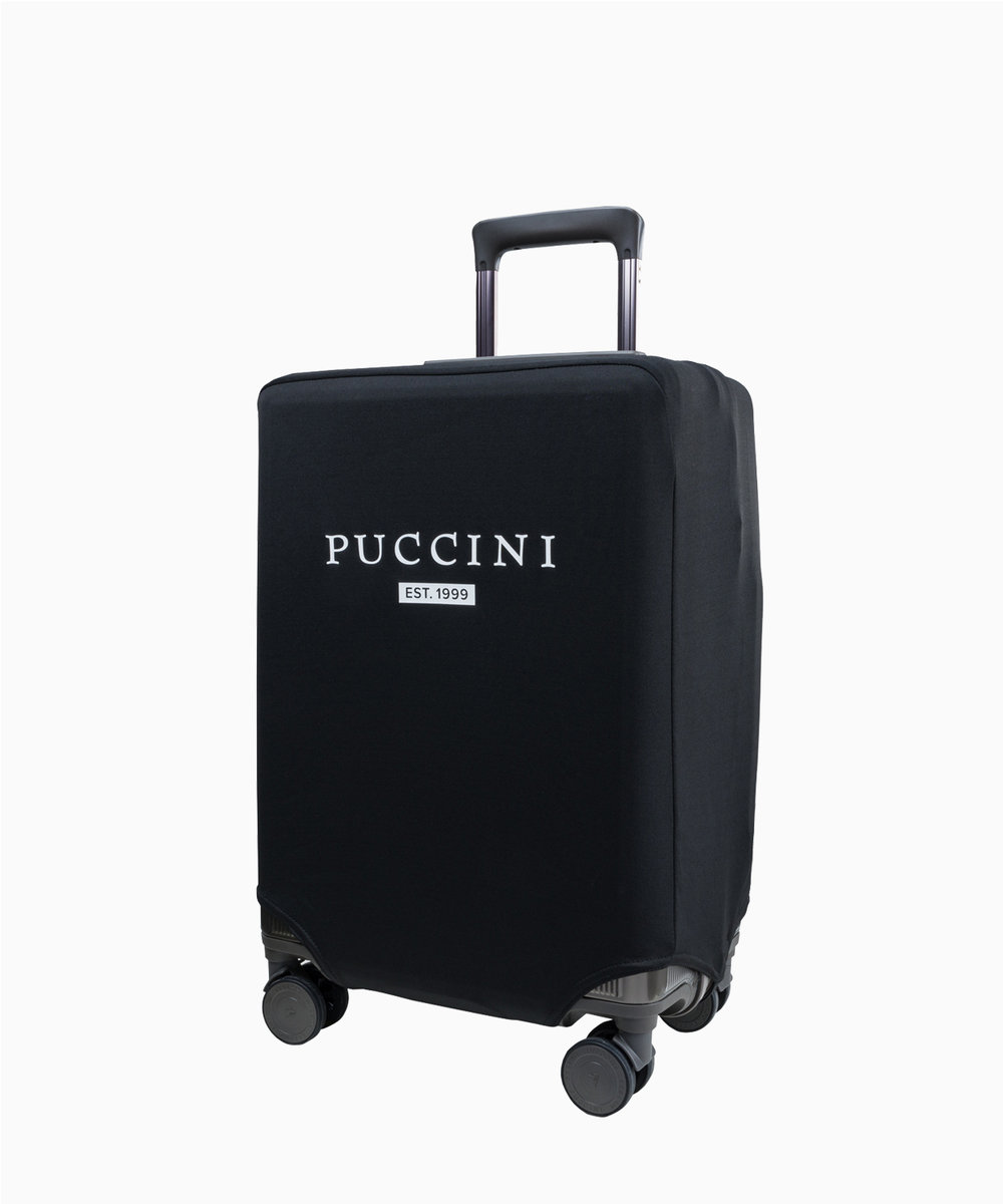 ⏩ Czarny pokrowiec ozdobiony jest dużym, kontrastowym białym napisem PUCCINI, który nadaje mu stylowy wygląd i sprawia, że walizka z pewnością wyróżni się na tle innych bagaży.