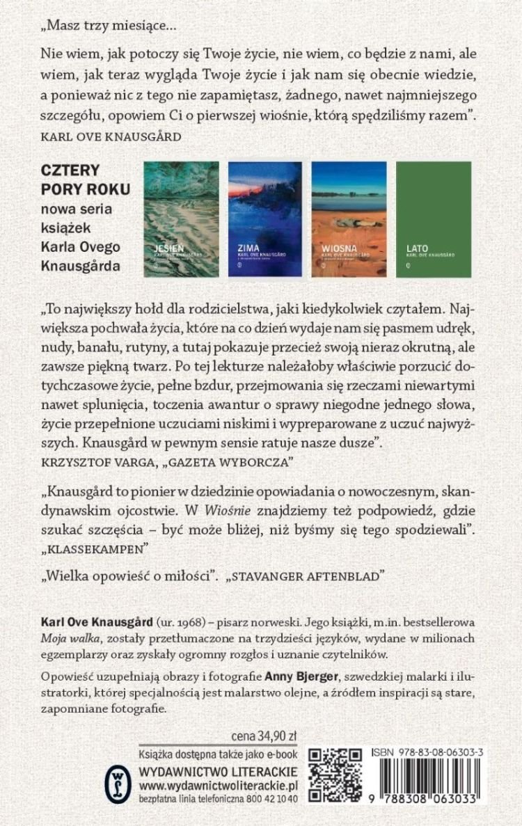 Po jesiennej nostalgii i zimowym oczekiwaniu w życiu Karla Ovego Knausgårda rozkwita szczęście. Oto jego czwarte dziecko, córka, z myślą o której stworzył cykl "Cztery pory roku", ma już trzy miesiące. Czterdziestosześcioletni ojciec odczuwa jednak ulotność tych chwil i – by ocalić je od zapomnienia – wykorzystuje swój talent…