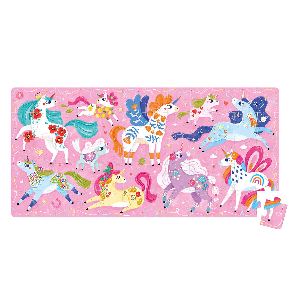 10 sympatycznych magicznych koników zaprasza do zabawy, która na wesoło rozwija spostrzegawczość, małą motorykę i przede wszystkim wyobraźnię. Duża układanka składa się z 60 puzzli. Poznajcie jednorożce i wymyślcie o nich własne historyjki. To pozycja obowiązkowa w pokoju młodych miłośników bajek, baśni i magicznych opowieści!