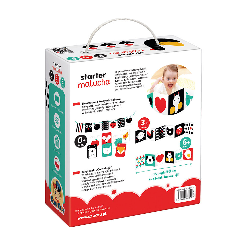 Nigdy nie jest za wcześnie na wspólne odkrywanie świata! Starter malucha to zestaw kontrastowych kart i książeczek do pokazywania, który sprawdzi się w pierwszym roku życia dziecka. Do zestawu dołączyliśmy poradnik z informacjami na temat rozwoju wzroku i pomysłami na wspólną zabawę. To świetny pomysł na prezent dla rodziców niemowląt.