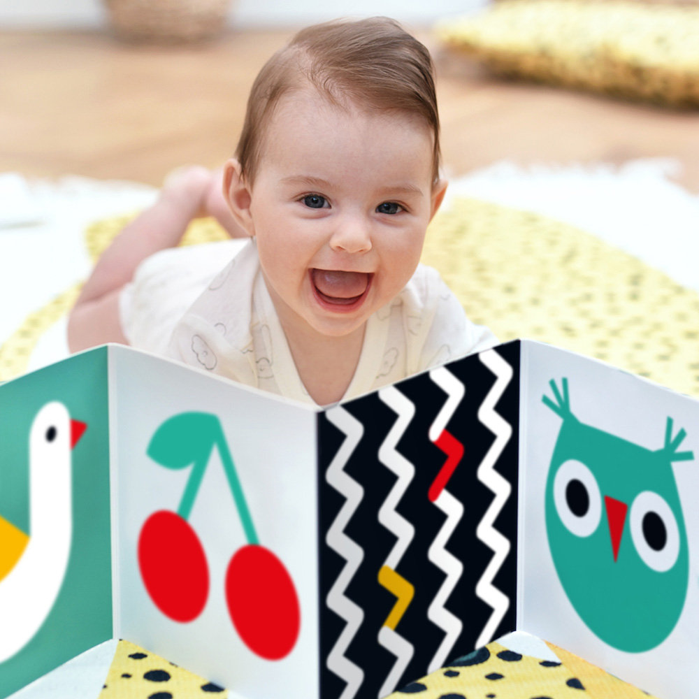 "Co widzę?” to kartonowe książeczki harmonijki z wyraźnymi, kontrastowymi ilustracjami. Oglądajcie je razem! Obrazki stopniowo stają się bardziej skomplikowane i kolorowe. Opowiadajcie o tym, co widać na ilustracjach - maluchy uwielbiają słuchać waszego głosu. Duże dwustronne karty kontrastowe możecie wykorzystać jako plansze do pokazywania lub stworzyć z nich efektowną girlandę, która pomoże w ćwiczeniu wzroku malucha i może stać się ozdobą dziecięcego pokoju.