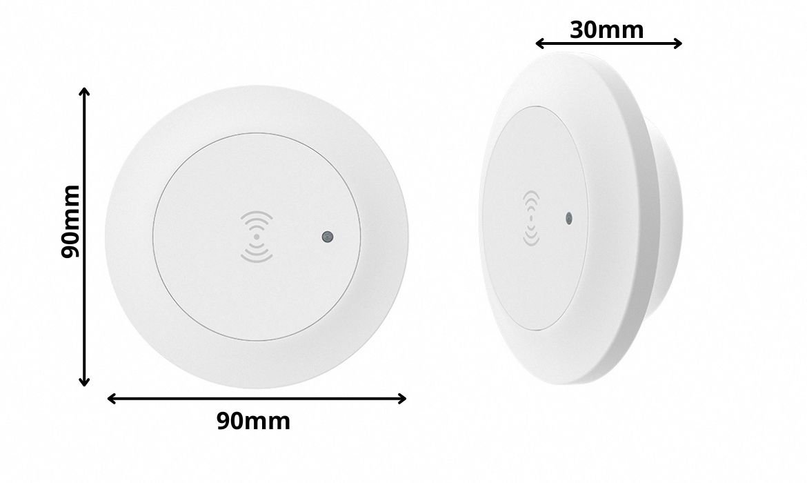 Czujnik ma wymiary 90x90x30mm, montaż możemy wykonać za pomocą śrubek (brak w zestawie) lub taśmy dwustronnej (brak w zestawie). Jego dyskretny design sprawia, że doskonale komponuje się z każdym wnętrzem, zarówno w domu, biurze jak i w hotelu czy innych przestrzeniach użytkowych. Idealny do miejsc wymagających estetycznego i funkcjonalnego rozwiązania.