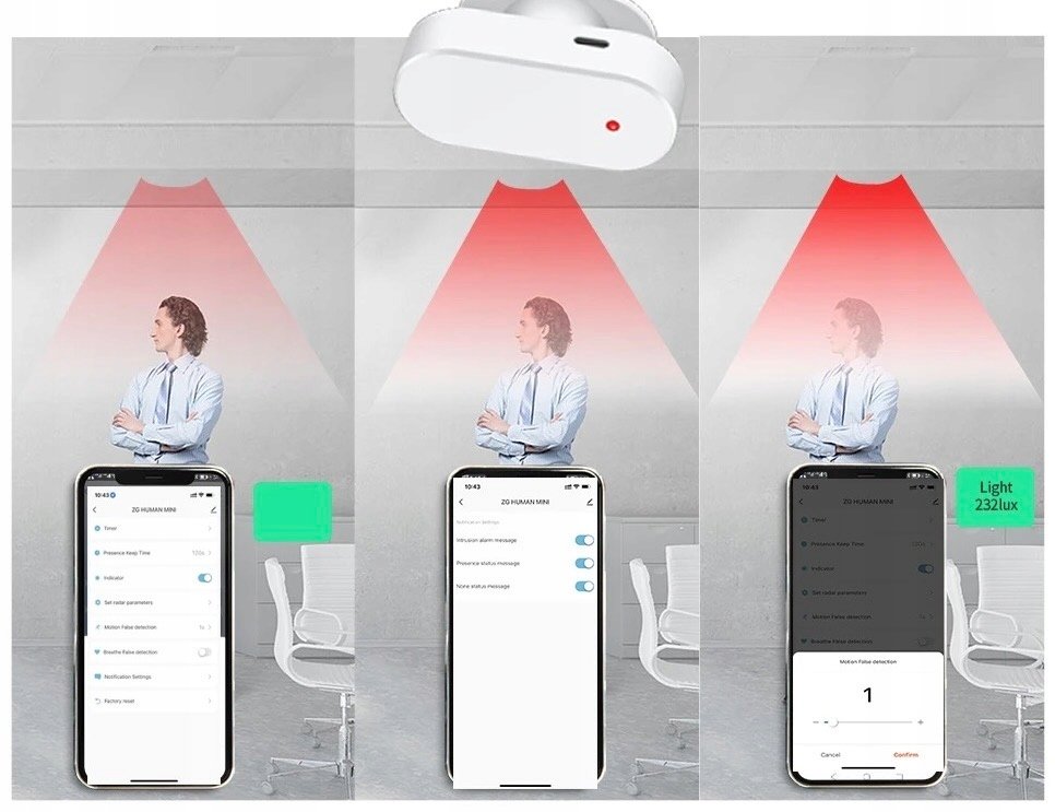 - Charakteryzuje się wykryciem obecności człowieka, statyką człowieka, mikroruchem człowieka i wykrywaniem ruchu człowieka w celu wykrycia obecności lub braku ludzi w obszarze, nawet w celu wykrycia stanu statycznego, takiego jak dokładny sen personelu, dzięki funkcji wykrywania radaru mmWave.