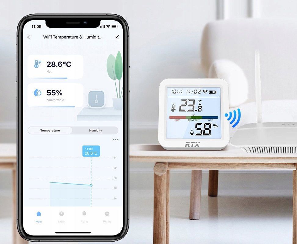 Czujnik Sensor Temperatury i Wilgotności LCD WiFi Tuya RTX Czujnik temperatury i wilgotności z wyświetlaczem LCDBezprzewodowy czujnik temperatury i wilgotności WiFi kompatybilny z Tuya Smart ...