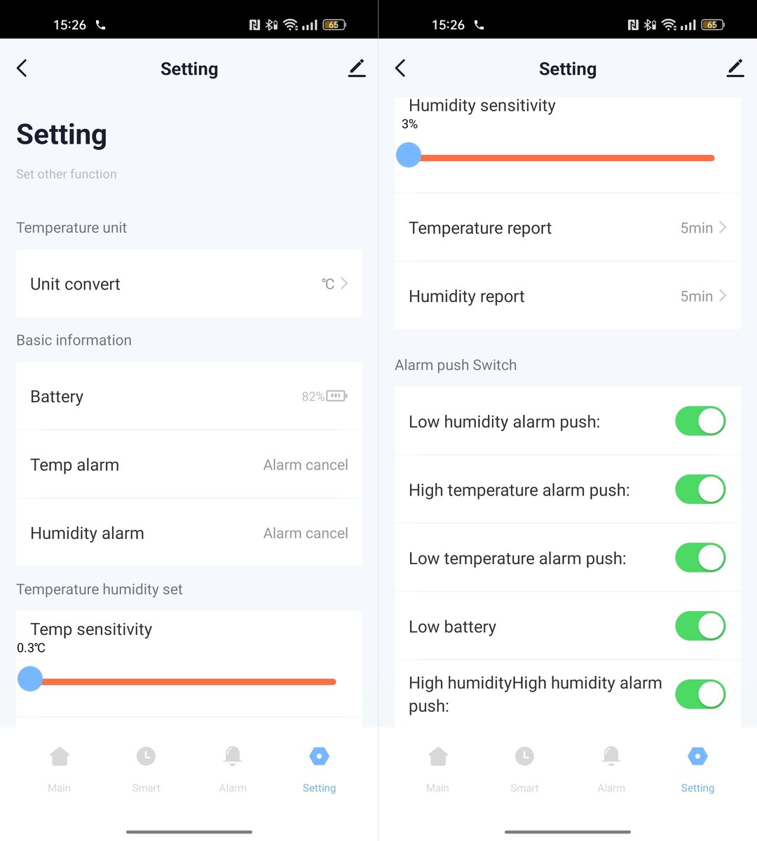 - Regulowany cykl raportu od temperatury/wilgotności/czas