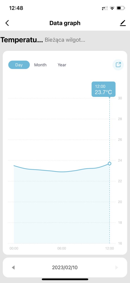 Nasz czujnik temperatury i wilgotności prezentuje dane w czasie rzeczywistym oraz historie odczytów, z funkcji podglądu można skorzystać na 3 sposoby, odczytać dane rzeczywiste nie wchodząc w szczegóły urządzenia, zobaczyć wykres ostatnich odczytów lub wejść w wykres rozszerzony, w którym zobaczymy dane z podziałem na: