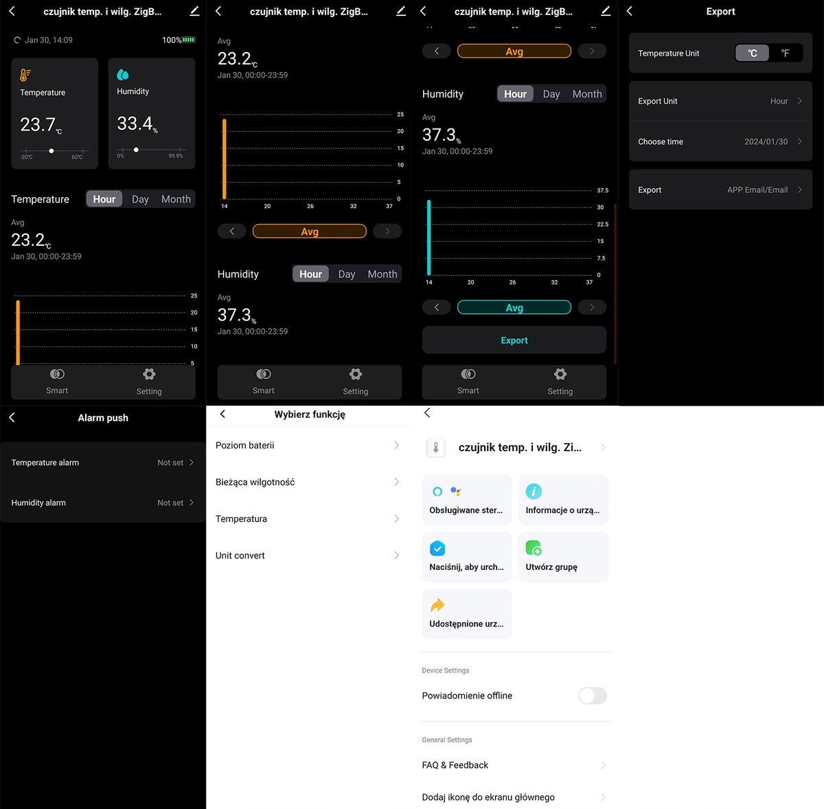 - Możliwe ustawienie zdarzeń w zależności od temperatury, wilgotności, przekroczenia granicznych warunków dla każdej z wartości.