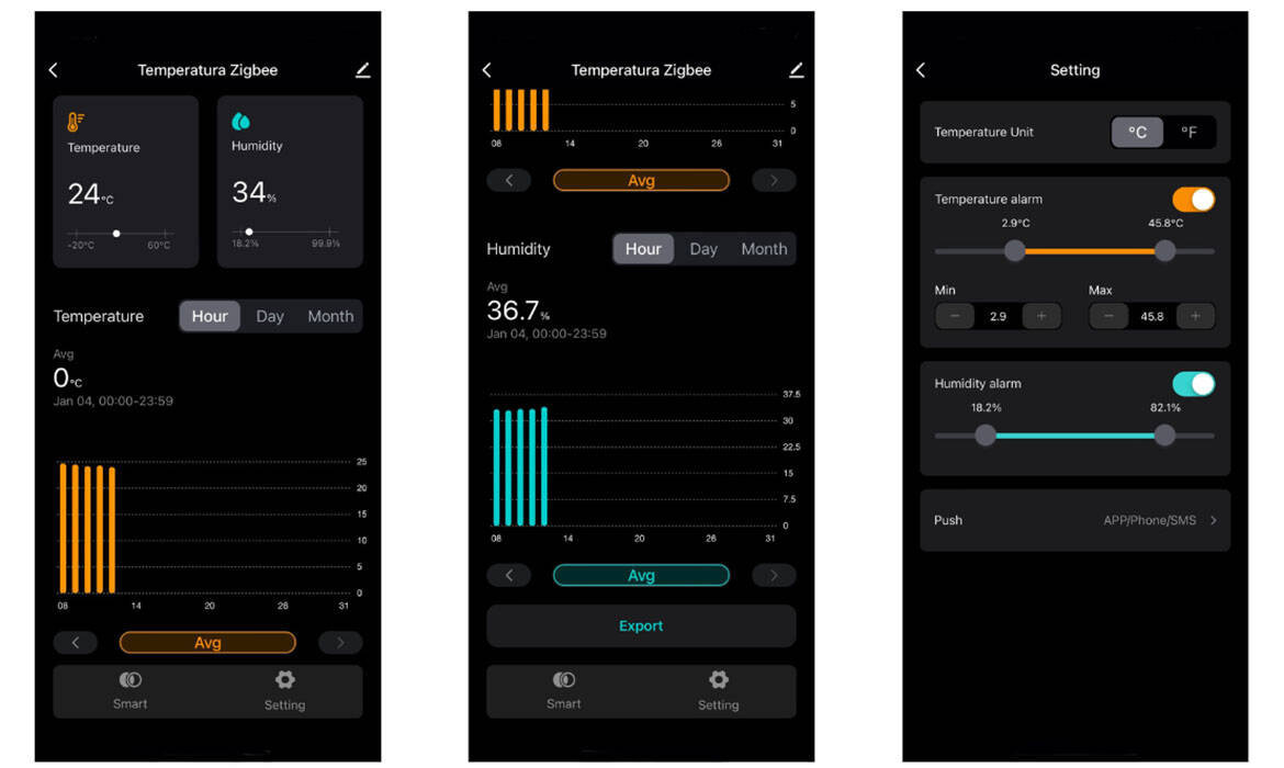 - Ustawienia powiadomień przy przekroczeniu temperatur oraz niskim stanie baterii.