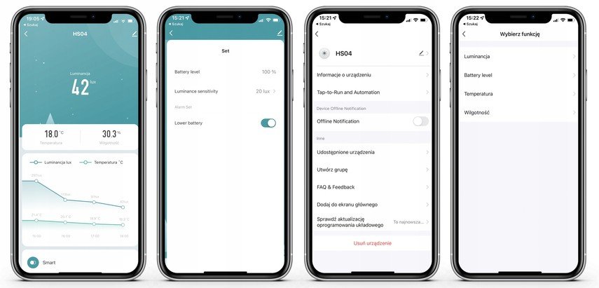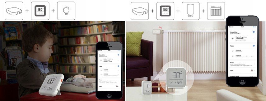 Aplikacja, która obsługuje urządzenie może połączyć ze sobą ogromną ilość innego typu czujników. Można realizować sceny, używać urządzenia z timerem, tworzyć różne ustawienia dla konkretnych zachowań itp.
