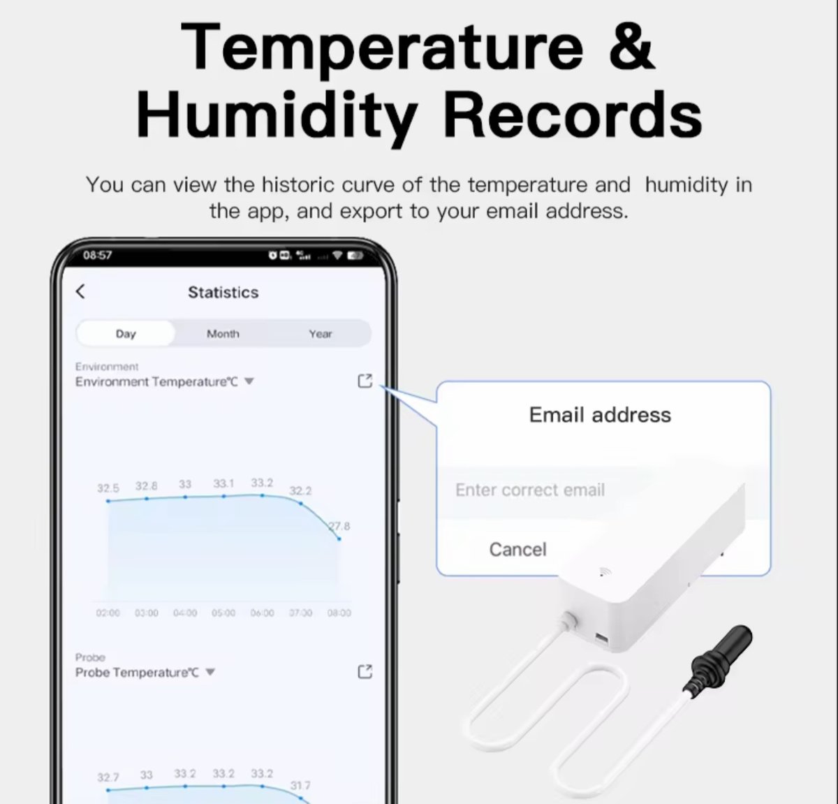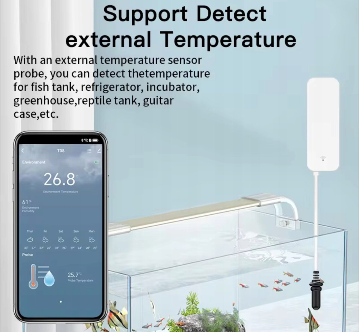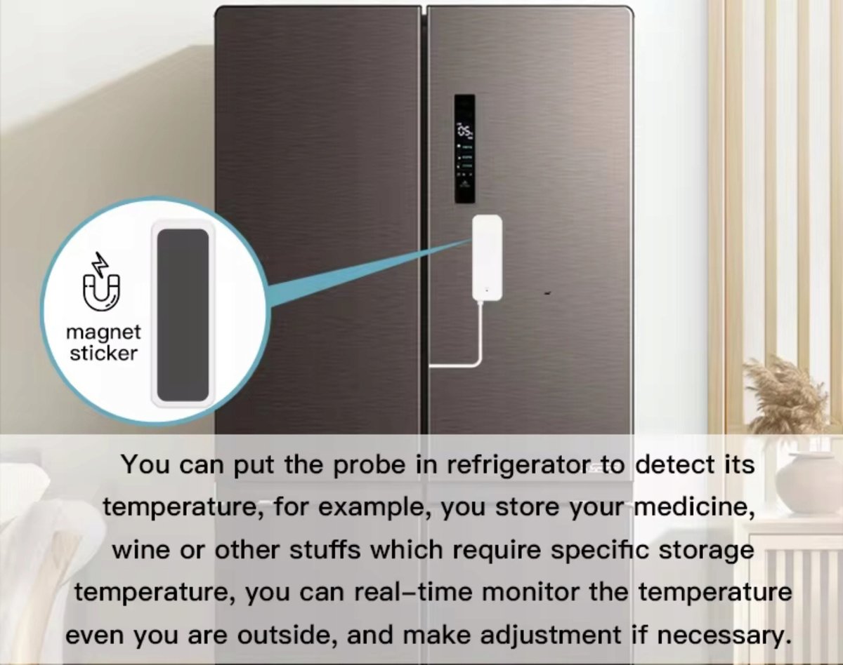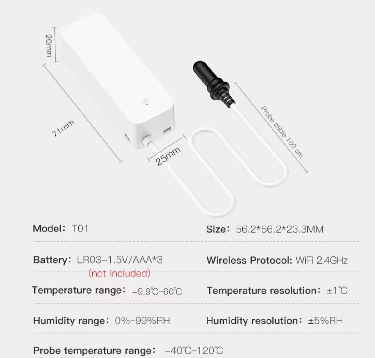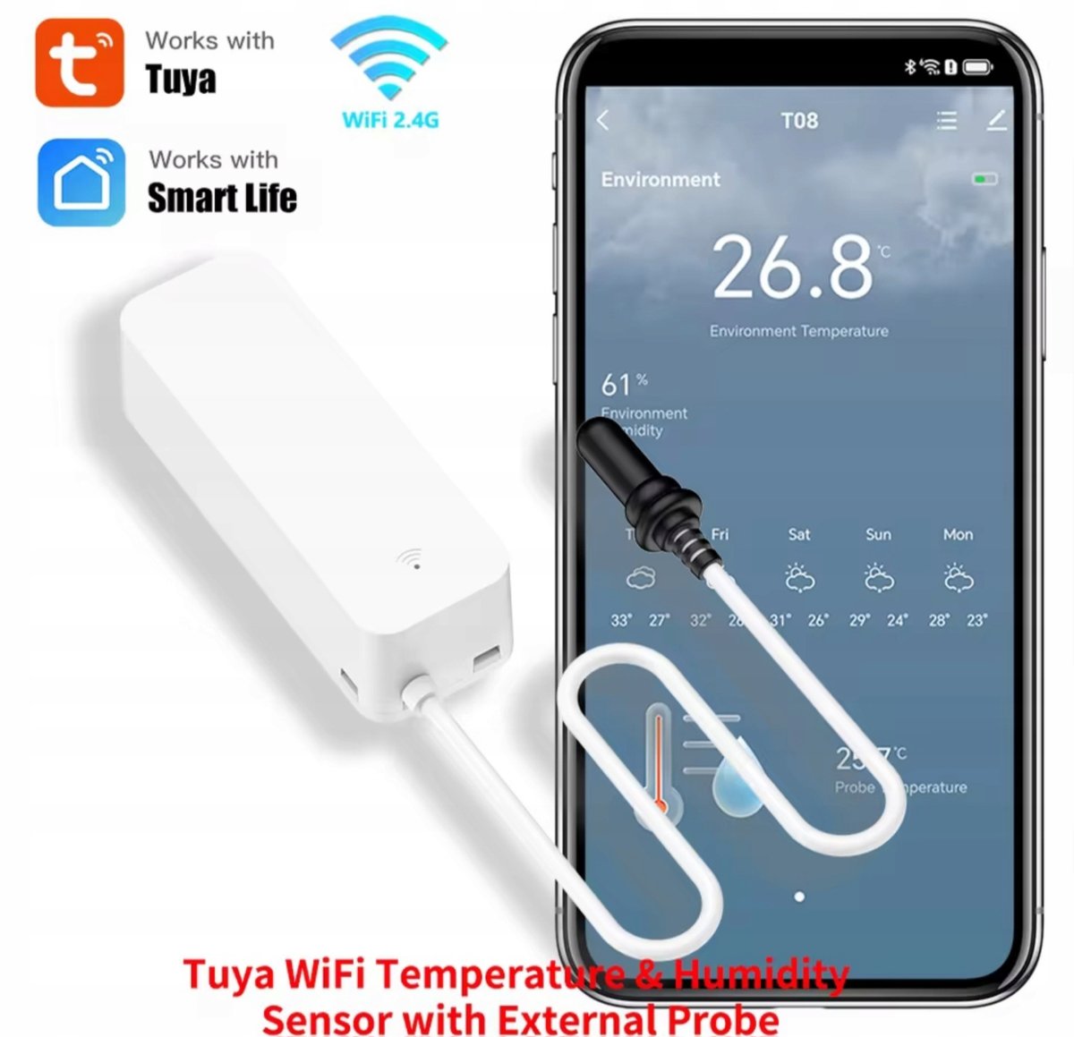 1 * czujniki temperatury i wilgotności Tuya Wifi wraz z sondą zewnętrzną o długości 100cm.