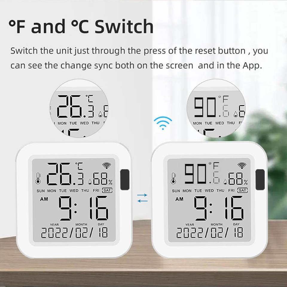 Dzięki czujnikom o wysokiej precyzji, wilgotność i temperatura w pomieszczeniu są monitorowane w czasie rzeczywistym. Możesz przełączać jednostki temperatury między ℉ a °C.