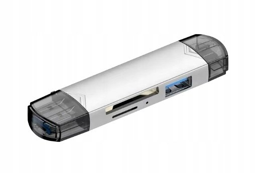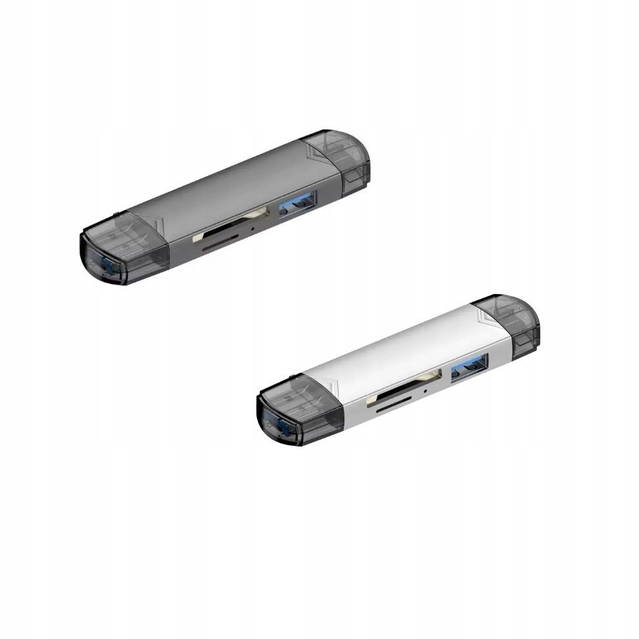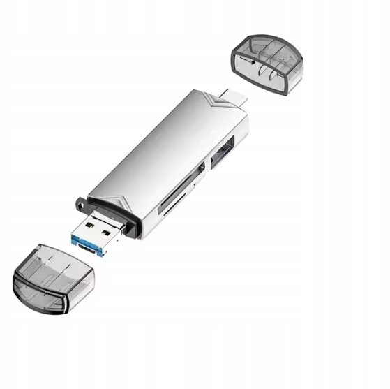 Czytnik kart pamięci 5 in 1 w kolorze (silver) srebrny z wyjściami typu USB 3.0 x2, USB typu C oraz gniazdami na kartę SD oraz TF. Urządzenia pomocnicze dla telefonu komórkowego, laptopa, stacjonarnego komputera. (JASER)