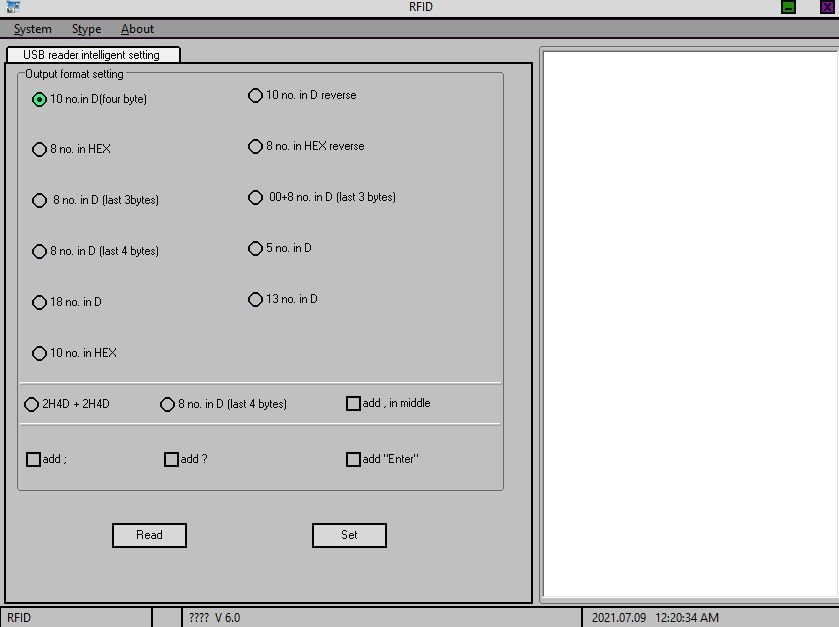 - Standardowo 8H10D ( 4B ) np. z karty o numerze seryjnym C9:0C:4F:B8 odczytuje B84F0CC9, konwertuje na system dziesiętny i zwraca numer 3092188361 oraz znak nowej linii