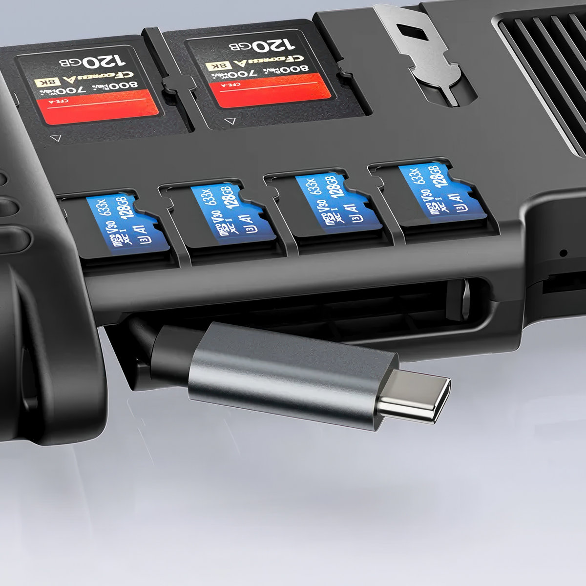 - przegródki na: 3 karty CFexpress Type-A, 4 karty SD, 4 karty microSD (TF) i 4 karty nanoSIM