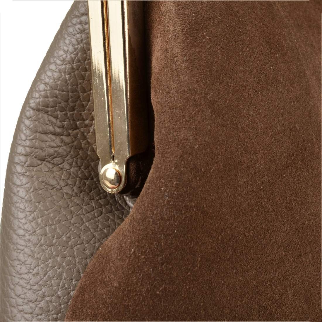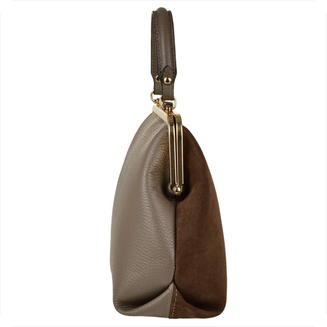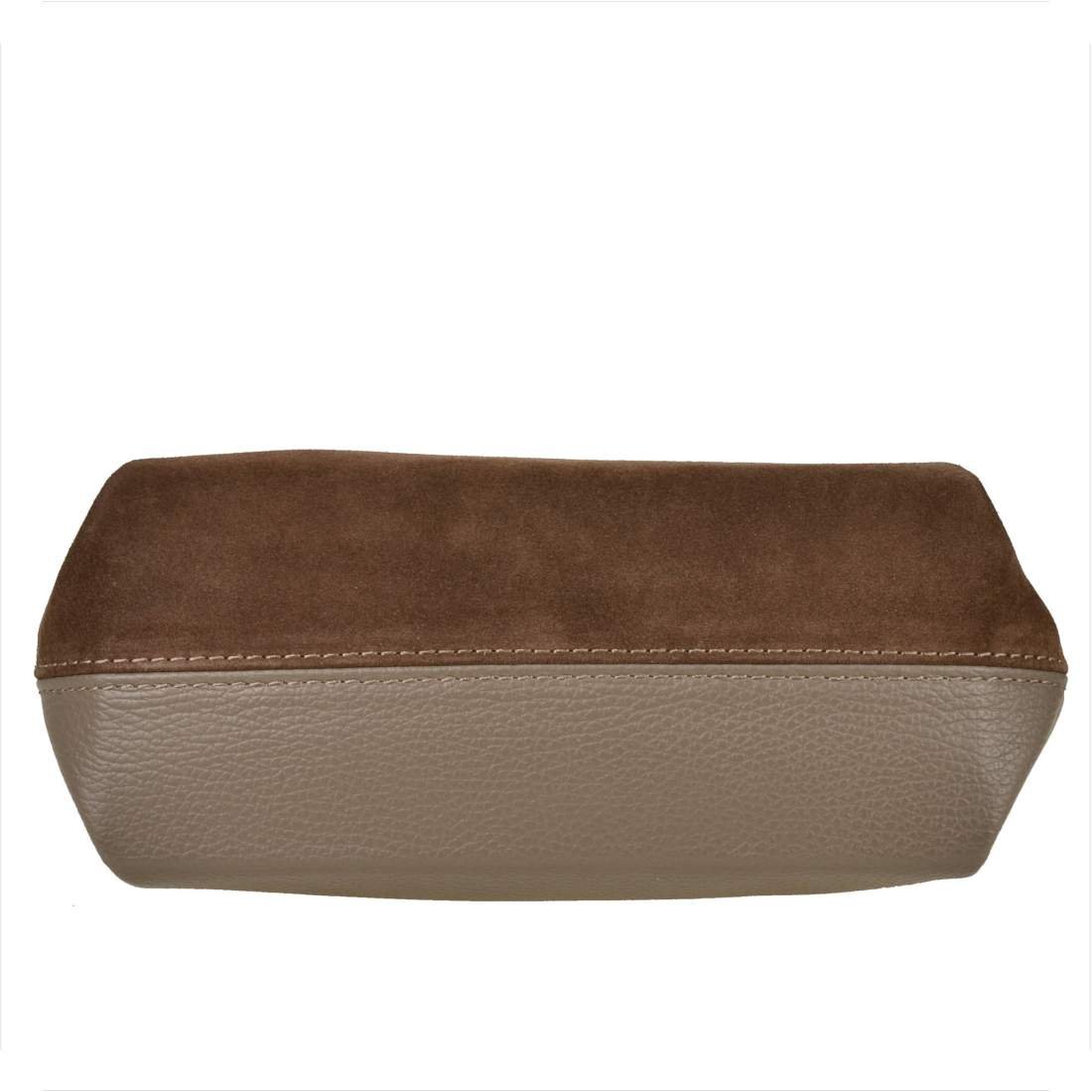 Proponujemy Państwu torebkę skórzaną listonoszkę kuferek brąz taupe połączenie skóry i zamszu w modnym fasonie produkcji włoskiej w rozmiarze M w nowym zupełnie fasonie i wzorze zapinana na bigiel. Torebka może być noszona na ramieniu i także jak listonoszka przez ramie na długim pasku. Torebka posiada zgrabny wygląd jest bardzo lekka, wygodna, elegancka i pakowna. Wyprodukowana została ze starannie wyselekcjonowanych skór naturalnych. Pasuje do wielu różnych stylizacji i wyróżnia się doskonałą jakością wykonania. Przyciąga uwagę perfekcją wykonania, cechuje się dużą wytrzymałością i swoistym pięknem. Posiada dopinany pasek. Wewnątrz mieści się jedna kieszeń z zamkiem. Okucia są w kolorze złotym. Jest to model jedyny w swoim rodzaju i dla niektórych kobiet to właśnie idealna torebka.