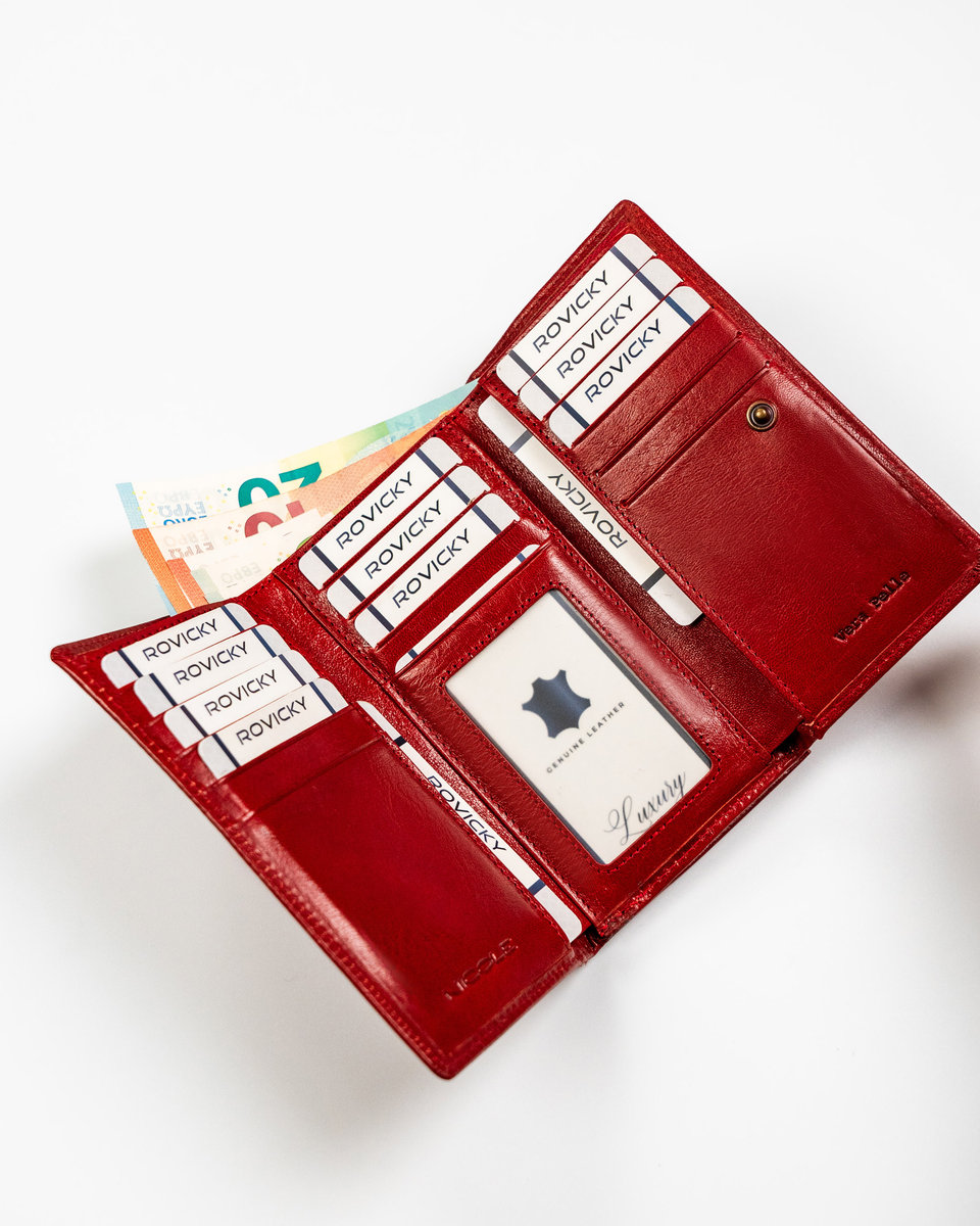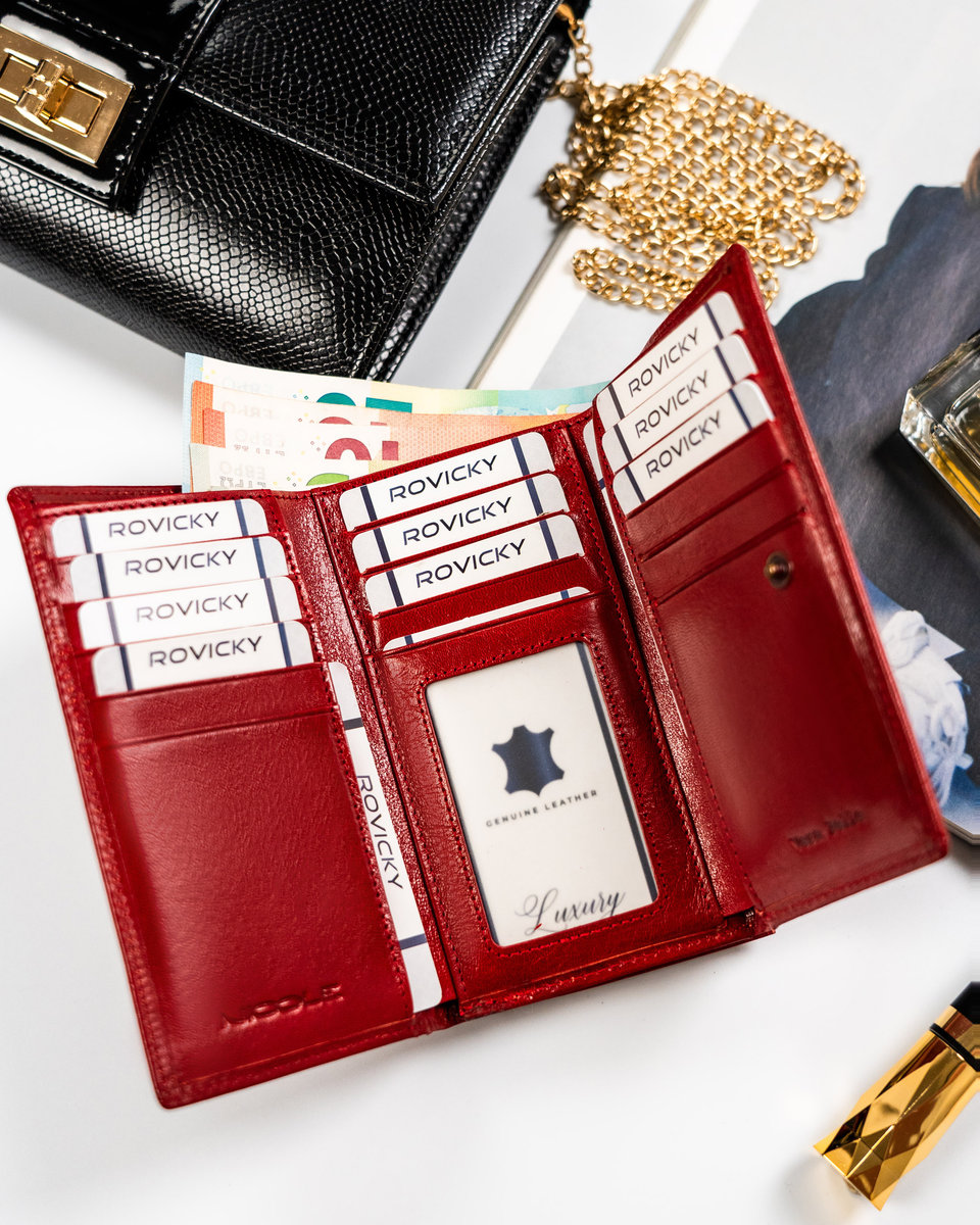 | Nazwa: | Damski skórzany portfel Nicole na karty i gotówkę portmonetka na bigiel, czerwony |