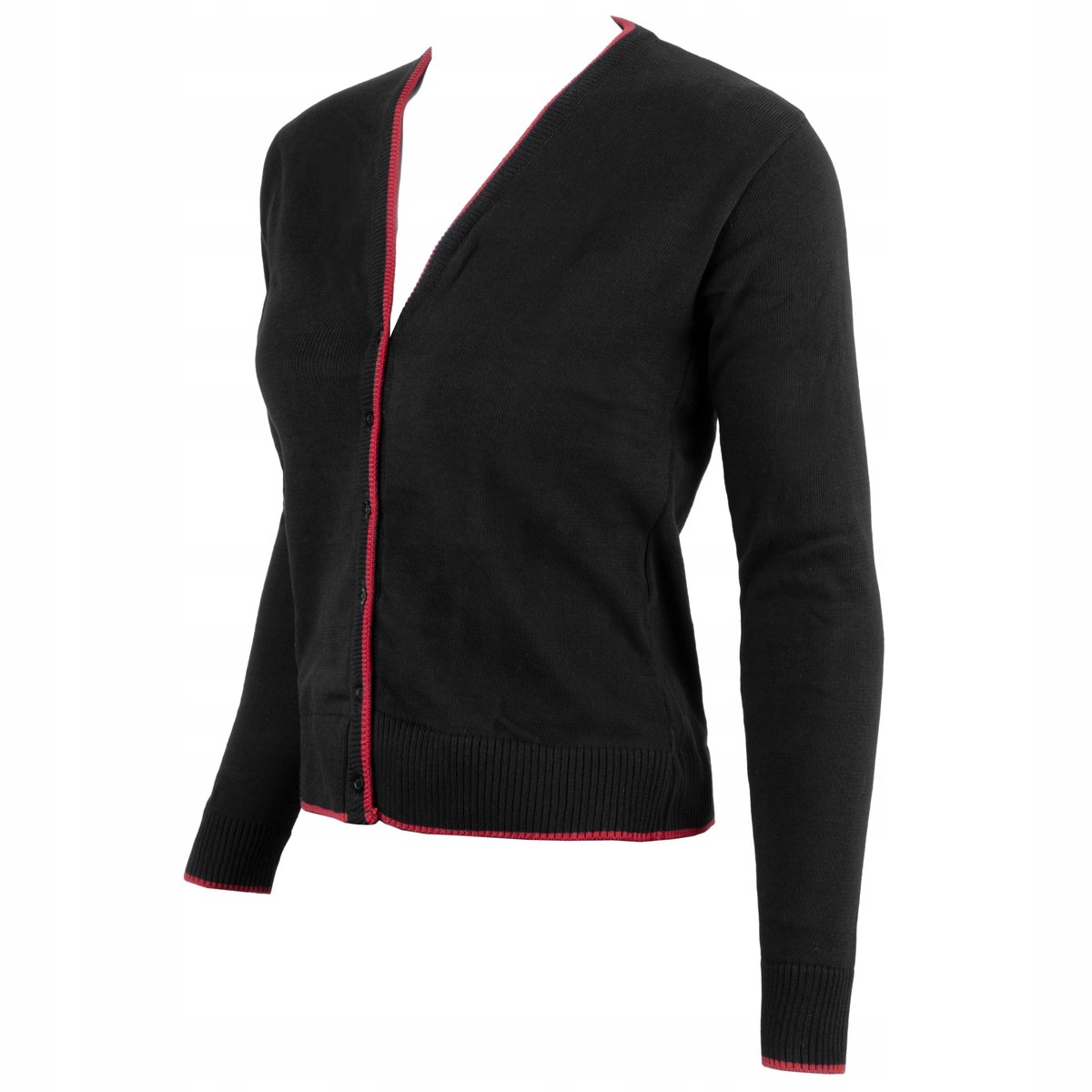 Stylowy i funkcjonalny sweter damski zapinany na guziki, w klasycznej czerni z kontrastowym czerwonym wykończeniem. Idealny wybór do biura, na uczelnię czy spotkania – podkreśla sylwetkę i pasuje zarówno do koszuli, jak i topu. Dekolt w serek i dopracowane detale nadają mu elegancki, a jednocześnie nowoczesny charakter.