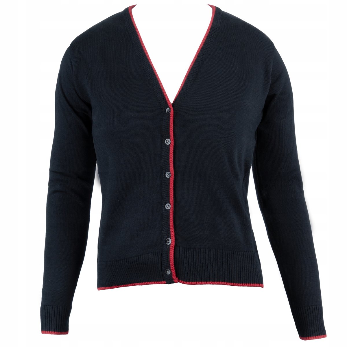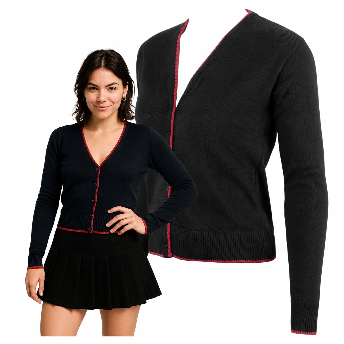 Stylowy i funkcjonalny sweter damski zapinany na guziki, w klasycznej czerni z kontrastowym czerwonym wykończeniem. Idealny wybór do biura, na uczelnię czy spotkania – podkreśla sylwetkę i pasuje zarówno do koszuli, jak i topu. Dekolt w serek i dopracowane detale nadają mu elegancki, a jednocześnie nowoczesny charakter.
