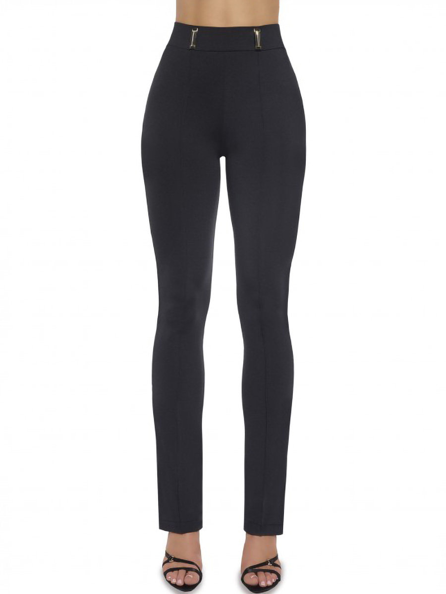 Eleganckie czarne spodnie damskie, które łączą klasykę z subtelnym akcentem ozdobnym. W pasie znajdują się eleganckie klamerki, które dodają im wyjątkowego charakteru. Wykonane z materiału o grubości