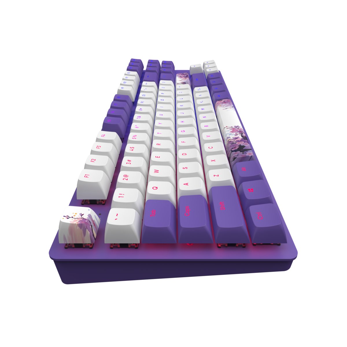 Ta kompaktowa klawiatura do gier jest wyposażona w 87 klawiszy i kombinację dwóch różnych wzorów nasadek klawiszy, które uzupełniają motyw fioletowo-biały. Ta kolorystyka nadaje klawiaturze ozdobną aurę. Ten model TKL jest idealnym rozwiązaniem dla każdego, kto potrzebuje więcej miejsca na biurku, aby swobodnie poruszać myszą, ale jednocześnie chce cieszyć się komfortem korzystania z klawiszy strzałek, które znajdują się z dala od głównego korpusu. Ta klawiatura im to zapewni.
