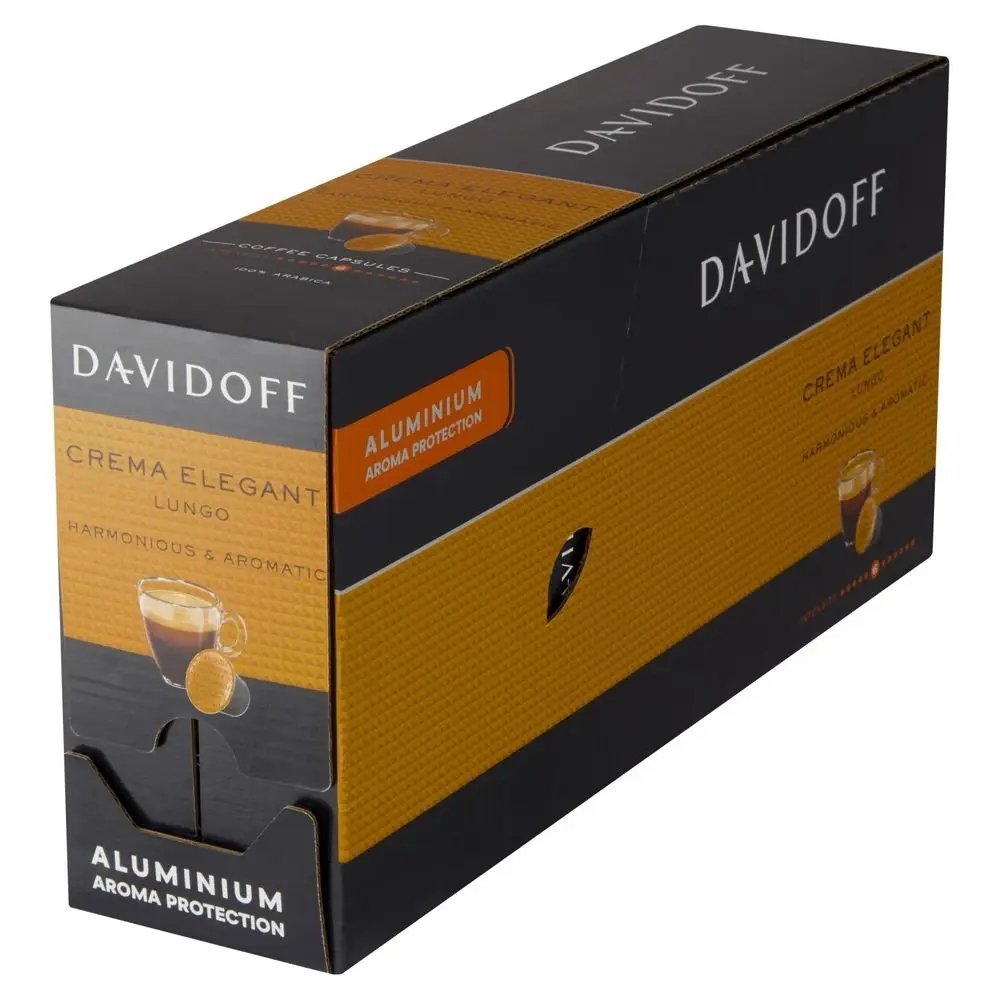Kapsułki Davidoff Crema Elegant gwarantują harmonijną kawę Lungo z bogatą cremą na wierzchu. Ta wyjątkowa mieszanka 100% Arabiki oczaruje podniebienie wymagającego miłośnika kawy swoim aromatycznym i pełnym smakiem. Wyrazista, a jednocześnie łagodna w smaku, kawa Davidoff Crema Elegant zapewnia codzienną dawkę przyjemności.