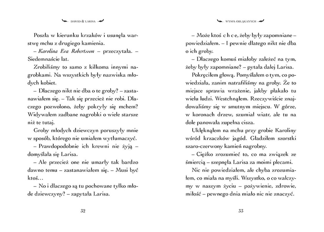 "Dawid i Larisa" to nowa seria Martina Widmarka – autora bestsellerowej serii Biuro Detektywistyczne Lassego i Mai. Tym razem książki przeznaczone są dla nieco starszych czytelników, ...Dawid i Larisa wybierają się na spacer, aby porobić zdjęcia i porozmawiać. Zauważają stary most prowadzący na tajemniczą wysepkę, gdzie wzbroniono wstępu. Nazywa się Wyspą Obłąkanych — dlaczego? Mimo zakazu bohaterowie idą, nie zważając na konsekwencje. Odkrywają stare groby dziewcząt. Musiały tragicznie zginąć przed laty, co pokazuje ich wiek. Jaka zagadka kryje się za śmiercią nieszczęsnych nastolatek? Co Dawidowi i Larisie pokaże Anna prowadząca zakład zegarmistrzowski? A z całą sprawą ma związek zasłużony doktor, któremu nawet postawiono pomnik…