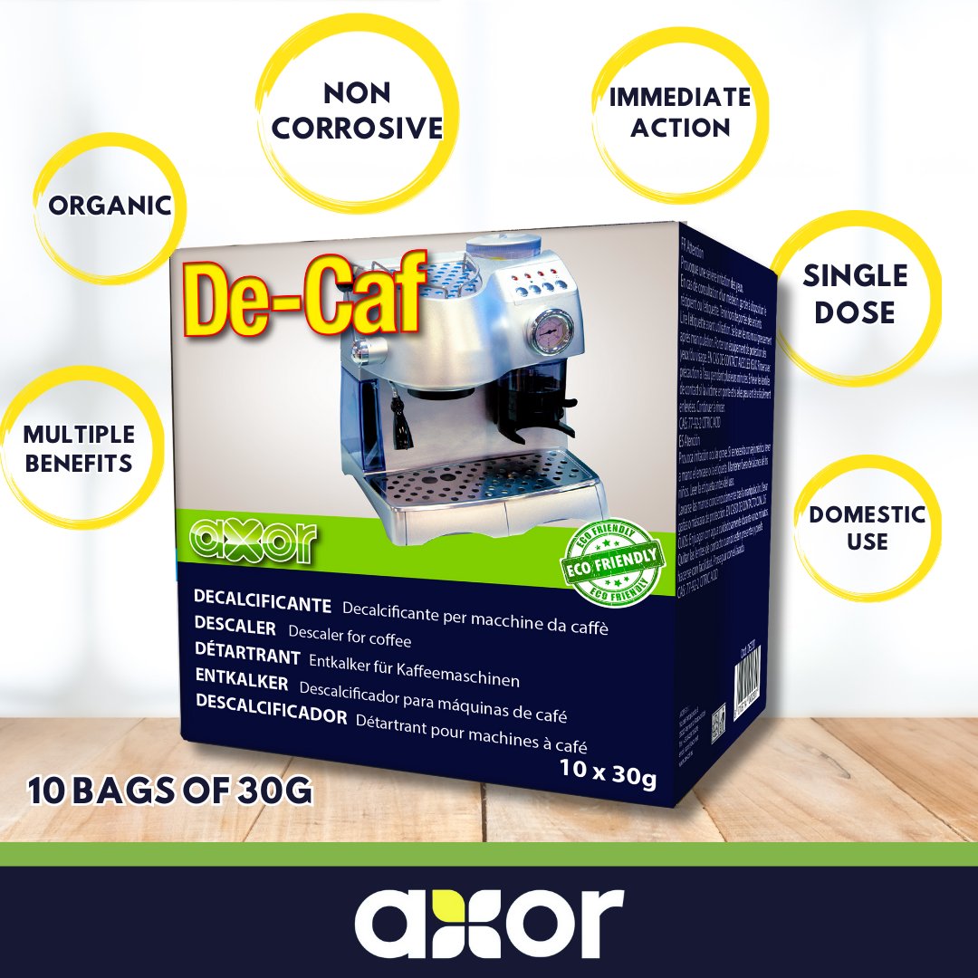 DE-CAF został specjalnie zaprojektowany, aby rozwiązać wszystkie te domowe problemy w praktyczny i ekologiczny sposób dzięki swojej formule opartej na kwasie cytrynowym naturalnego pochodzenia i jego formacie w postaci wstępnie dozowanych saszetek, które sprawiają, że jest łatwiejszy w użyciu i bezpieczniejszy niż zwykłe płynne środki odkamieniające.