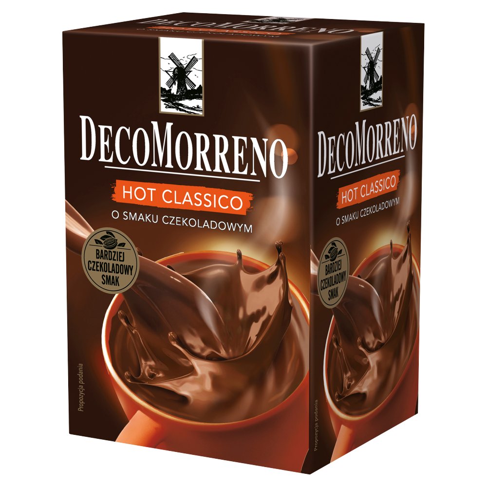 DECOMORRENO HOT CLASSICO 250g (10x25g)Napoje czekoladowe DecoMorreno to wyjątkowa porcja przyjemnej czekoladowej słodyczy. Stanowi idealną propozycję na chwilę rozgrzewającej przyjemności oraz ...