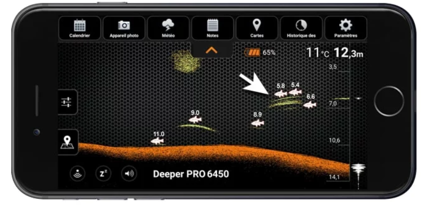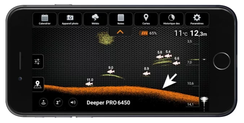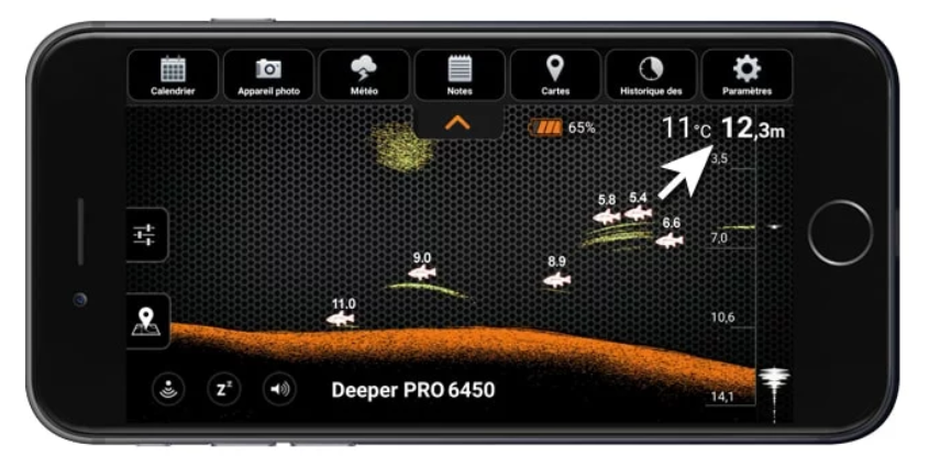 Głębokość i temperatura wody są wyświetlane z chwilą, gdy echosonda Deeper PRO znajdzie się w wodzie. Gdy echosonda ciągnięta za łodzią, alarm głębokości sygnalizuje wejście w obszar o żądanej głębokości.