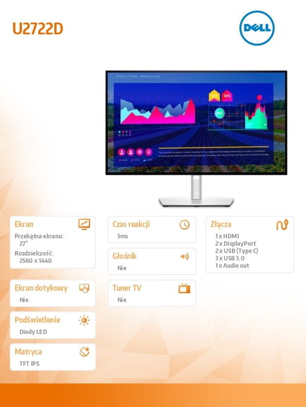 | Nazwa: | Dell Monitor U2722D 27 cali LED 2560x1440/HDMI/DP/USB-C |