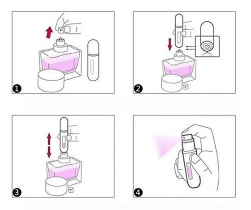 Wystarczy kilka sekund, aby wypełnić atomizer - po prostu wsuń go do dowolnego flakonu z perfumami, z odłączoną nasadką i kilkakrotnie naciśnij.